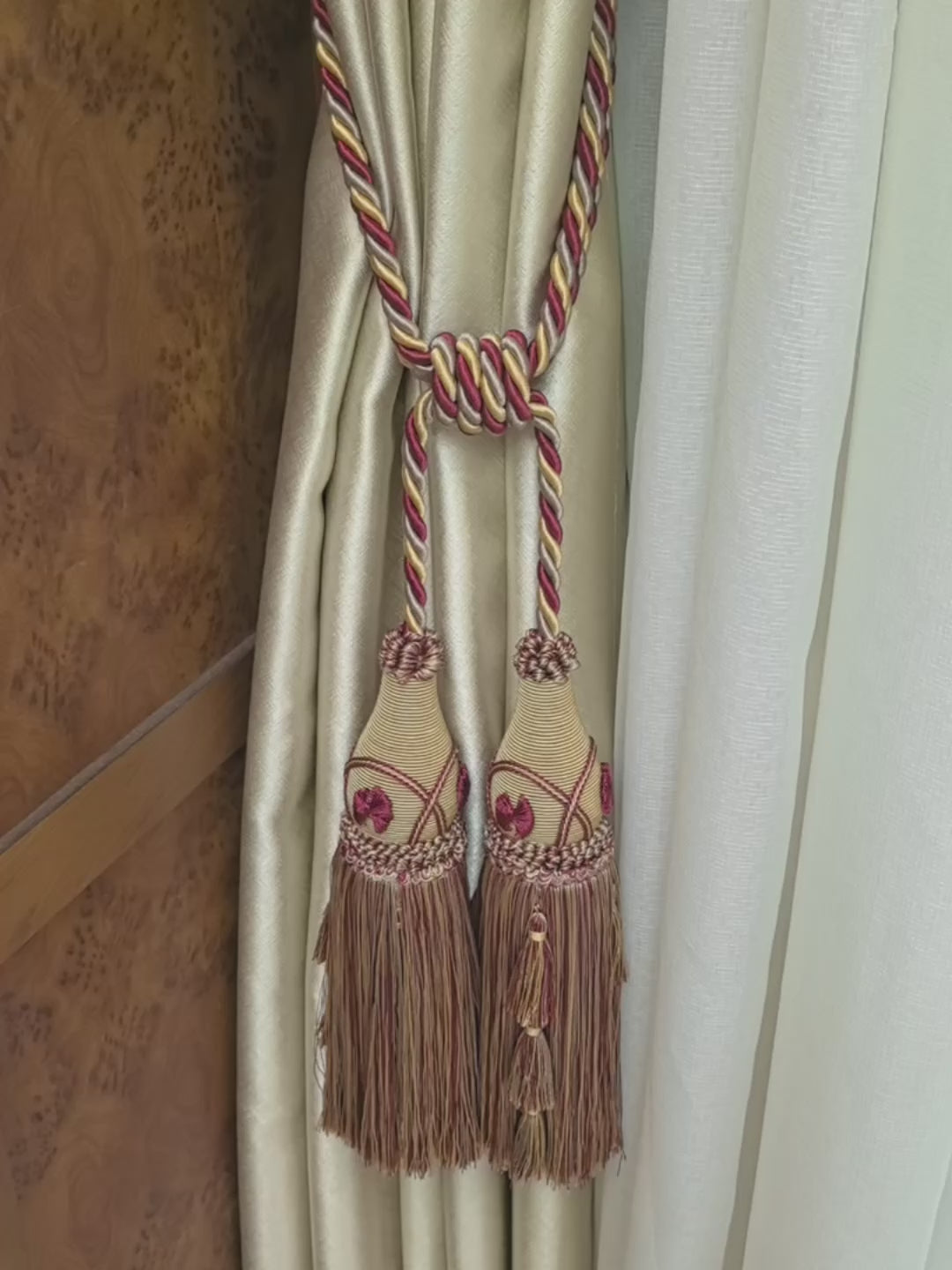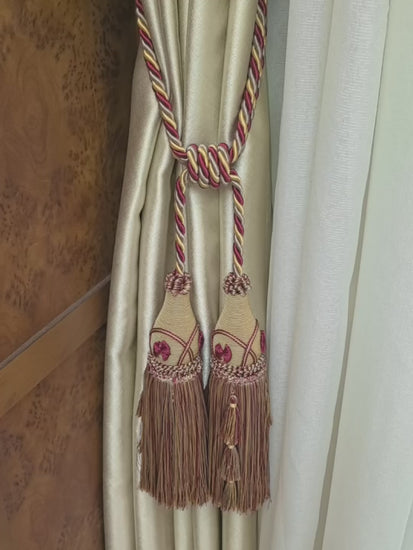 Bring vintage warmth and European charm to your home with this gold and burgundy double-tassel curtain tieback. The twisted rope blends gold, wine-red, and earthy brown tones, creating a sophisticated color palette that complements classic and traditional décor styles.