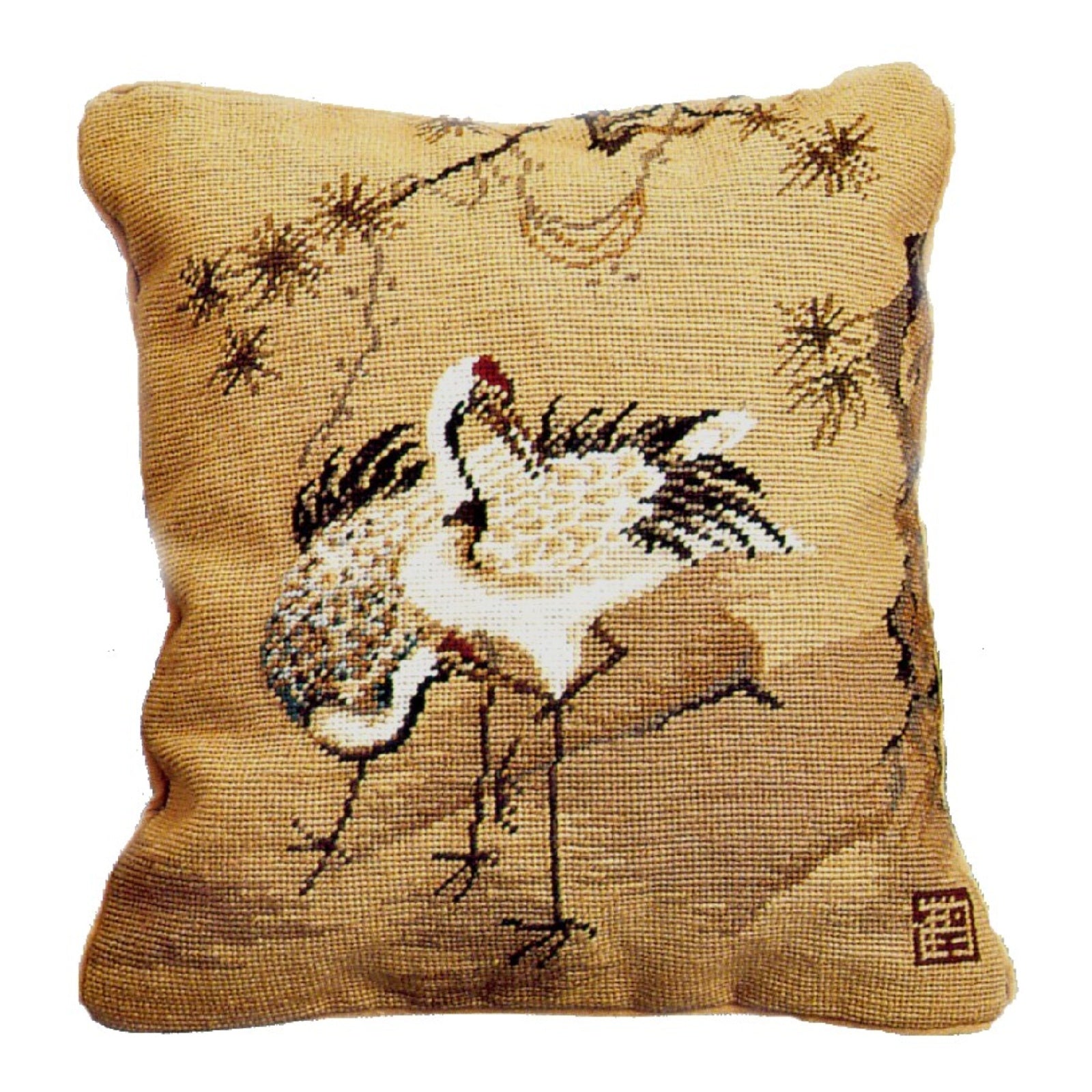 Handmade Wool Needlepoint Pillow Cover - Decorative Throw Cushion Cover - Vintage Floral Embroidery Design Cranes with pine tree 1