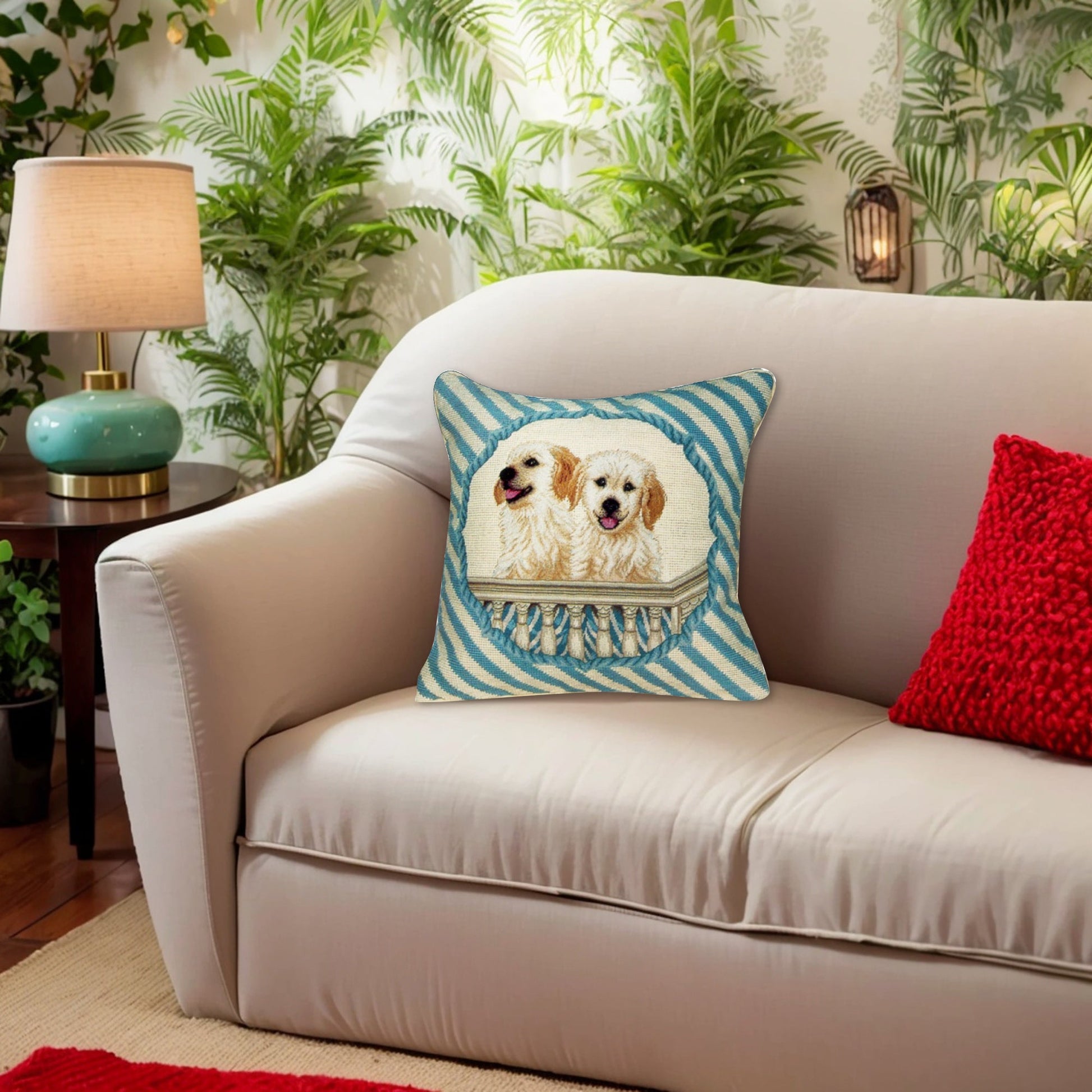 Handmade Wool Needlepoint Pillow Cover - Decorative Throw Cushion Cover - Vintage Floral Embroidery Design 2 puppies in balcony