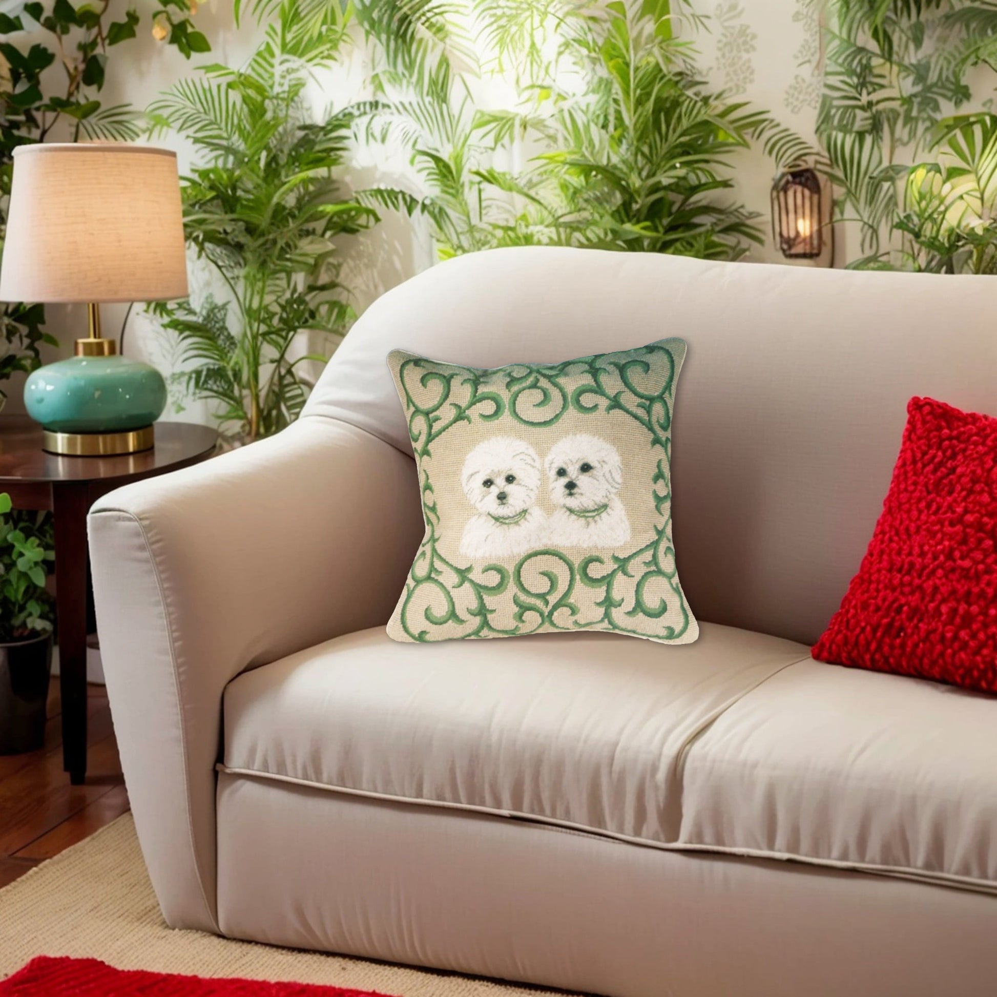 Handmade Wool Needlepoint Pillow Cover - Decorative Throw Cushion Cover - Vintage Floral Embroidery Design twin Westie in green leave frame