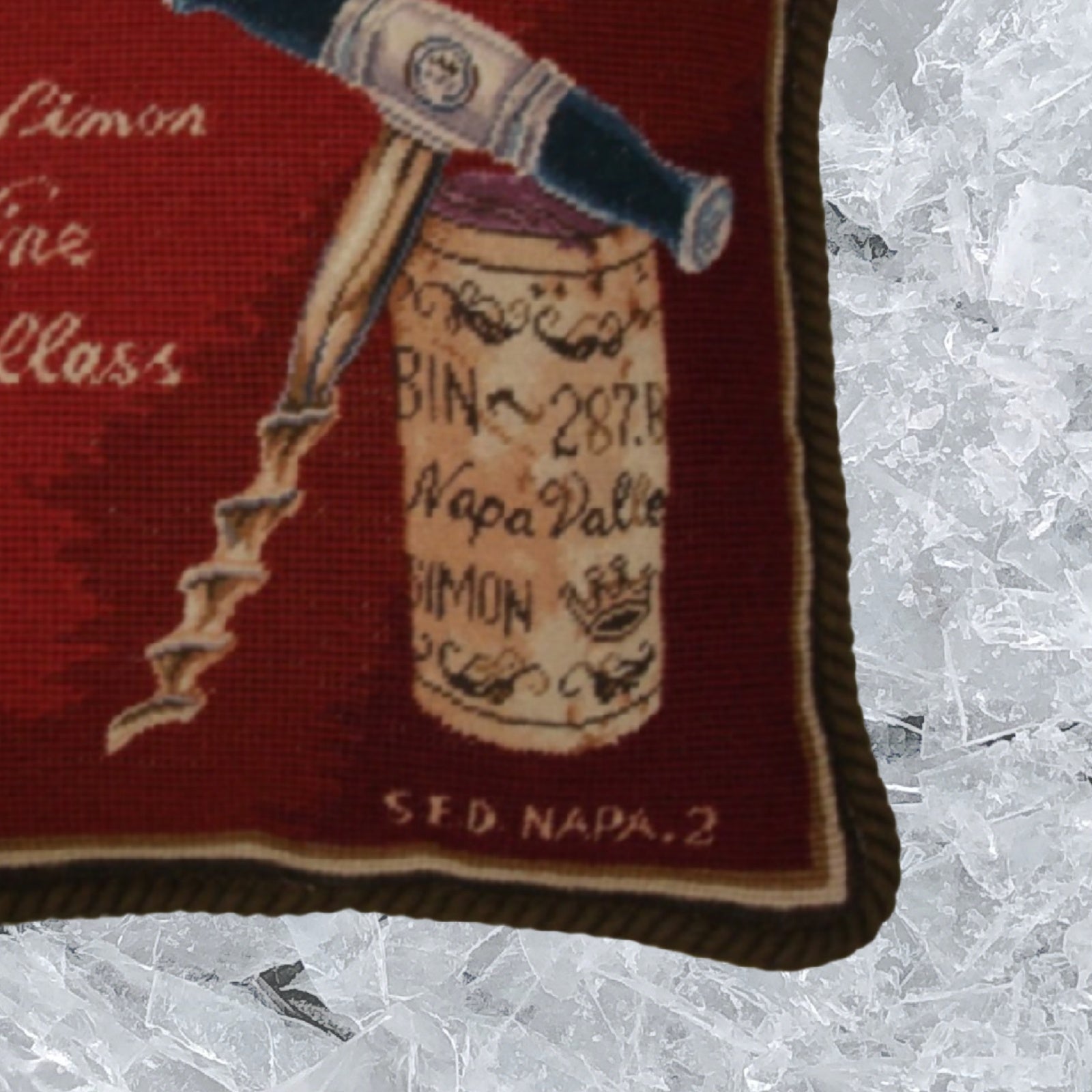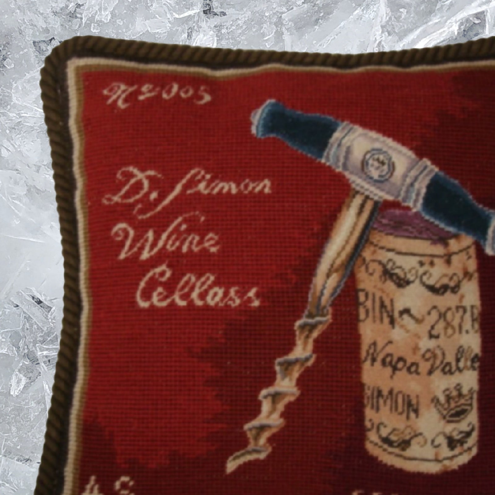 Handmade Wool Needlepoint Pillow Cover - Decorative Throw Cushion Cover - Vintage Floral Embroidery Design pin & cork red back Angela Staehling designBine 287 with cording