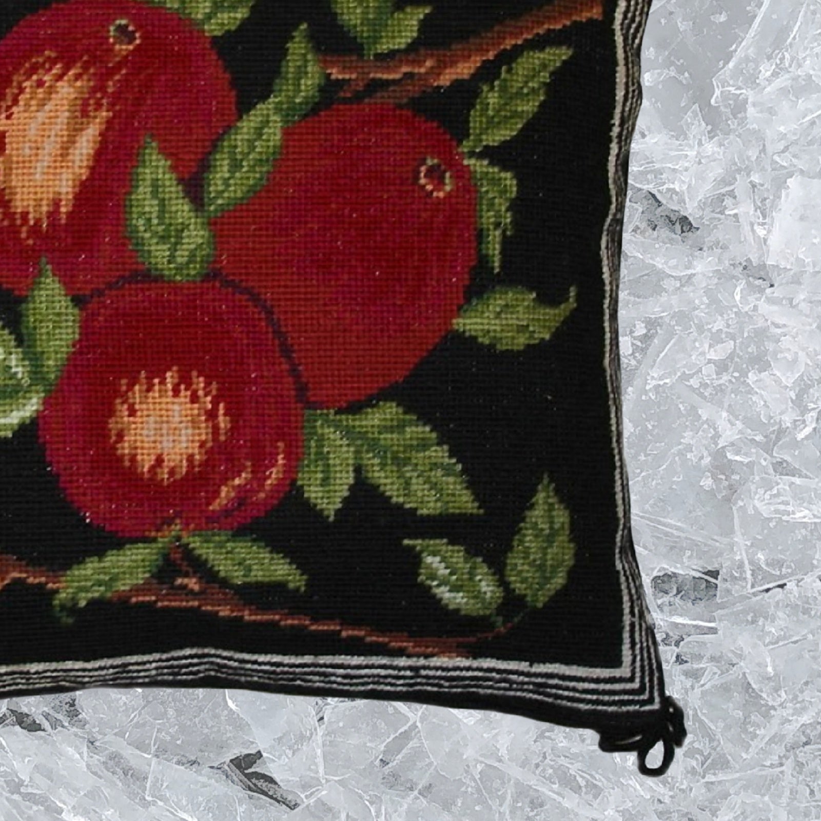 Handmade Wool Needlepoint Pillow Cover - Decorative Throw Cushion Cover - Vintage Floral Embroidery Design red apples black background