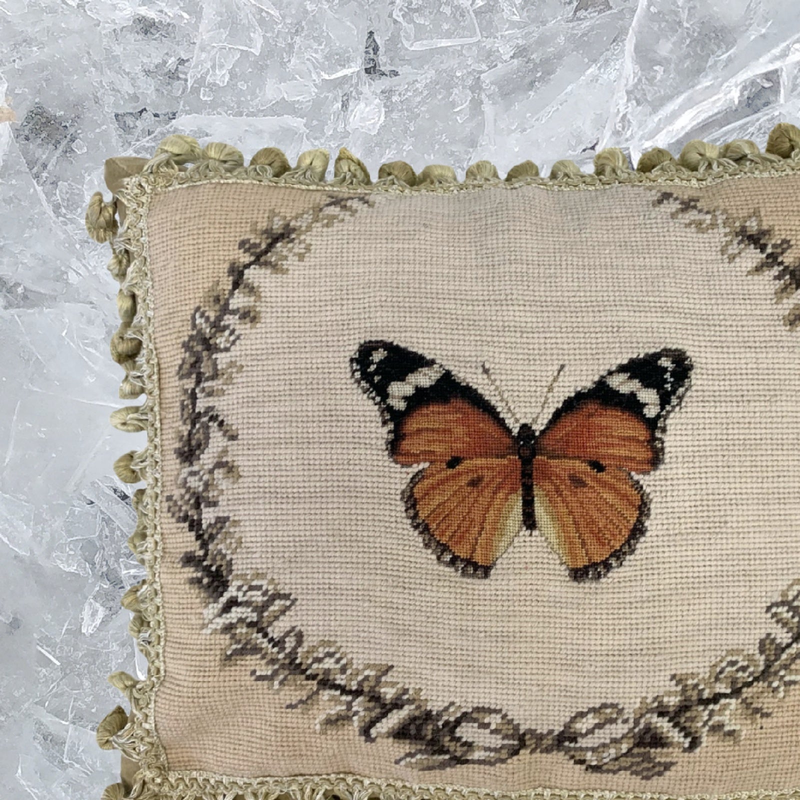 Handmade Wool Needlepoint Pillow Cover - Decorative Throw Cushion Cover - Vintage Floral Embroidery Design orange butterfly with 2 color tassel