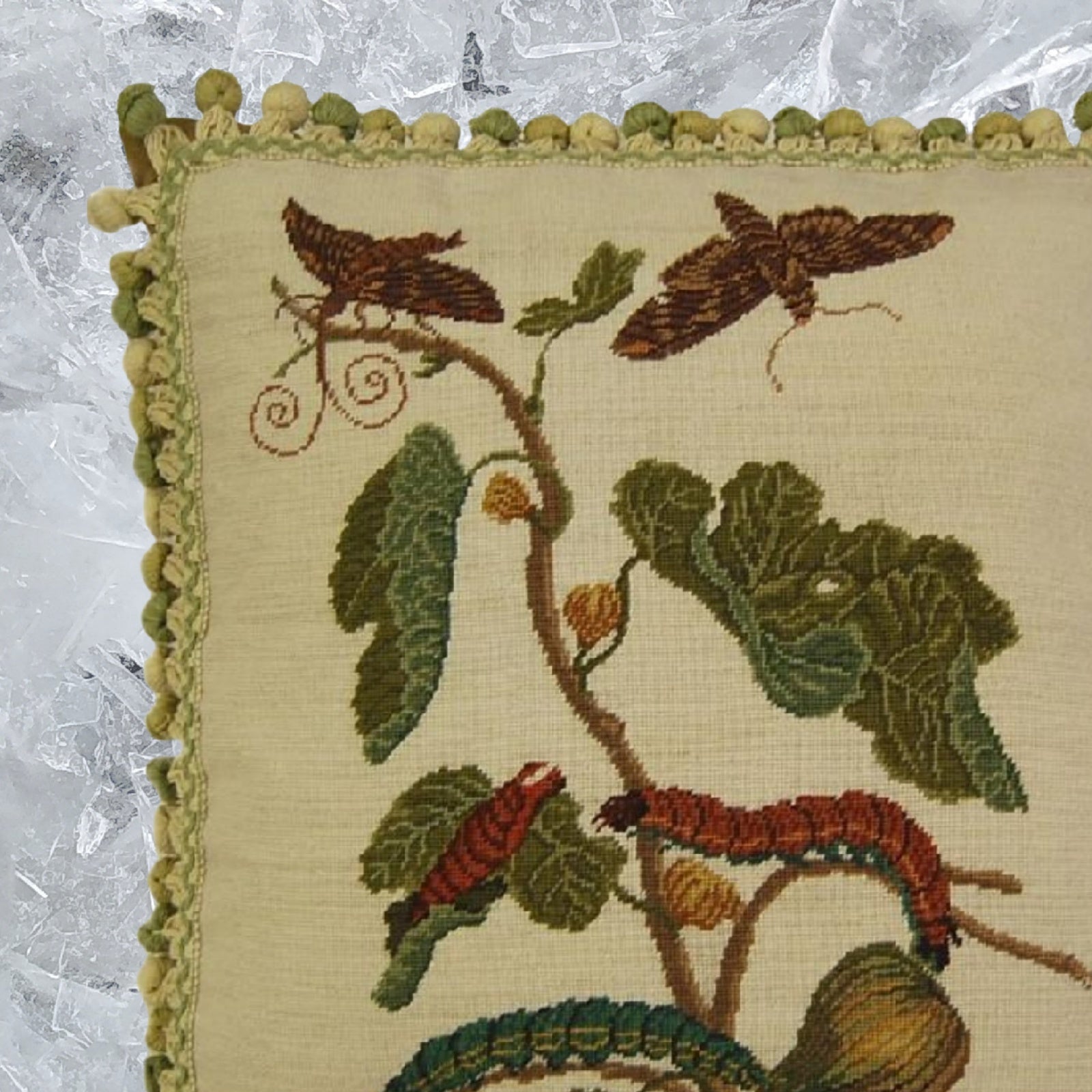 Handmade Wool Needlepoint Pillow Cover - Decorative Throw Cushion Cover - Vintage Floral Embroidery Design background, green/brown caterpillars with 3 color tassels