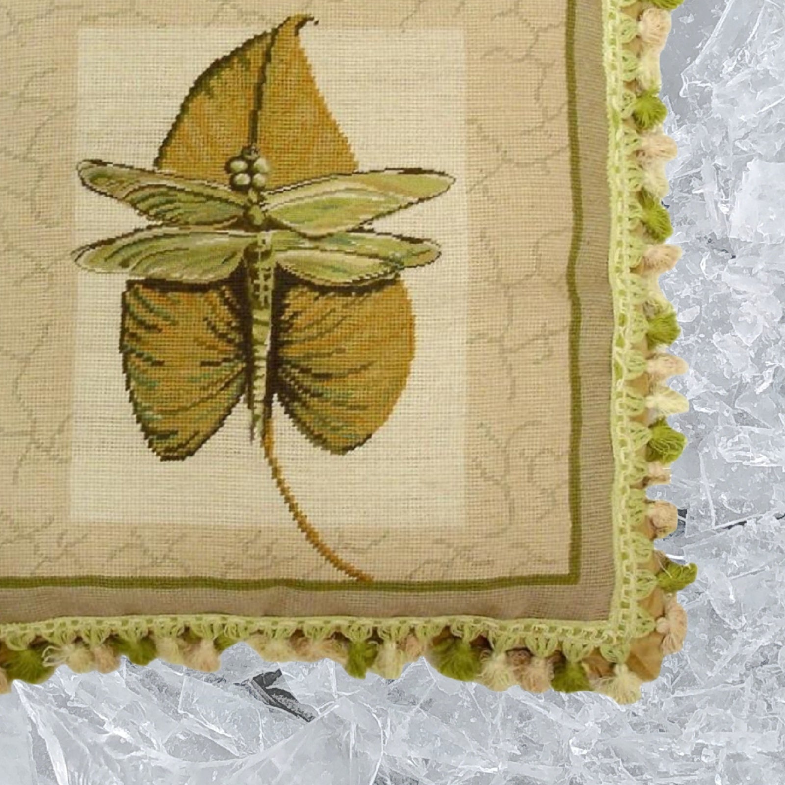 Handmade Wool Needlepoint Pillow Cover - Decorative Throw Cushion Cover - Vintage Floral Embroidery Design dragonfly background 2 color tassel
