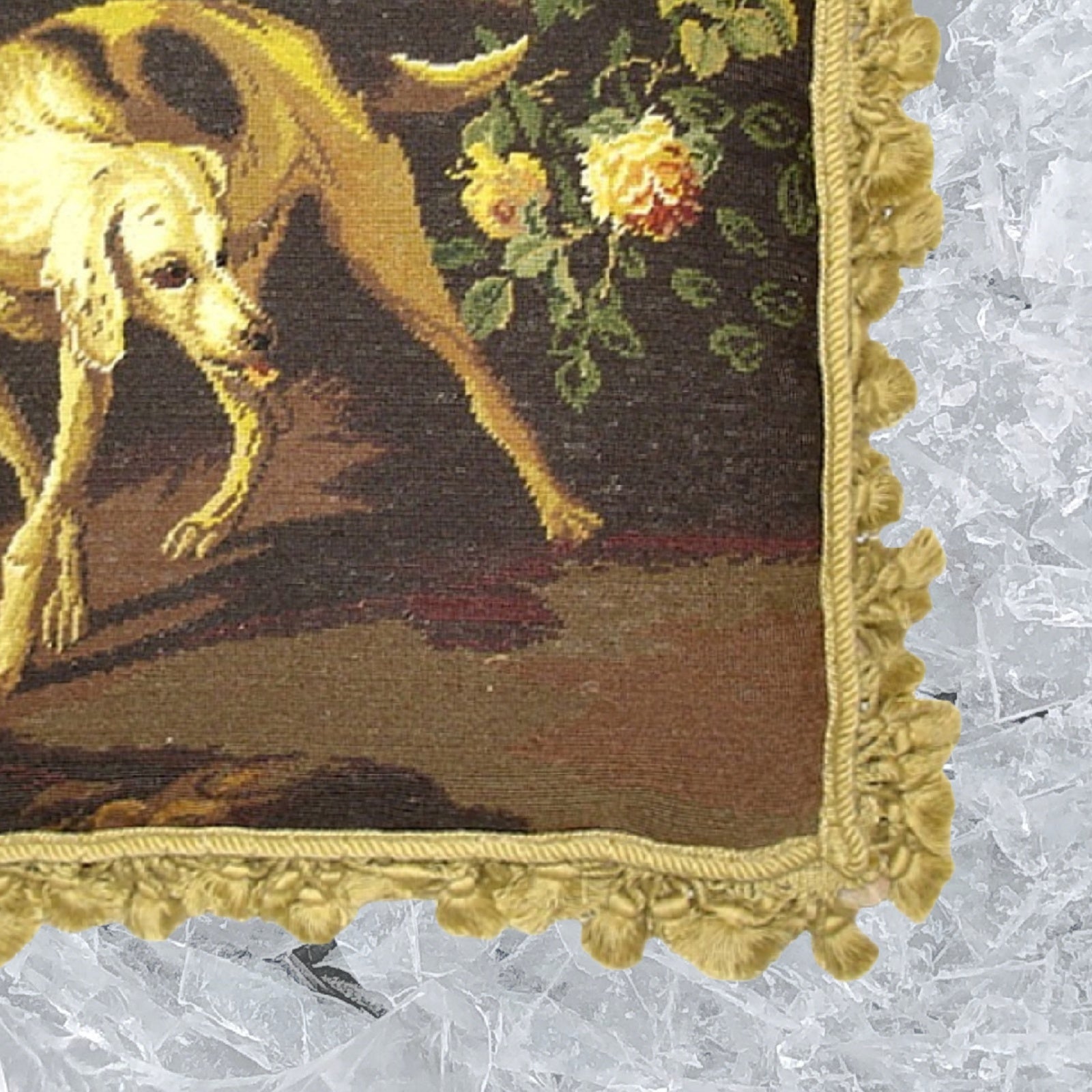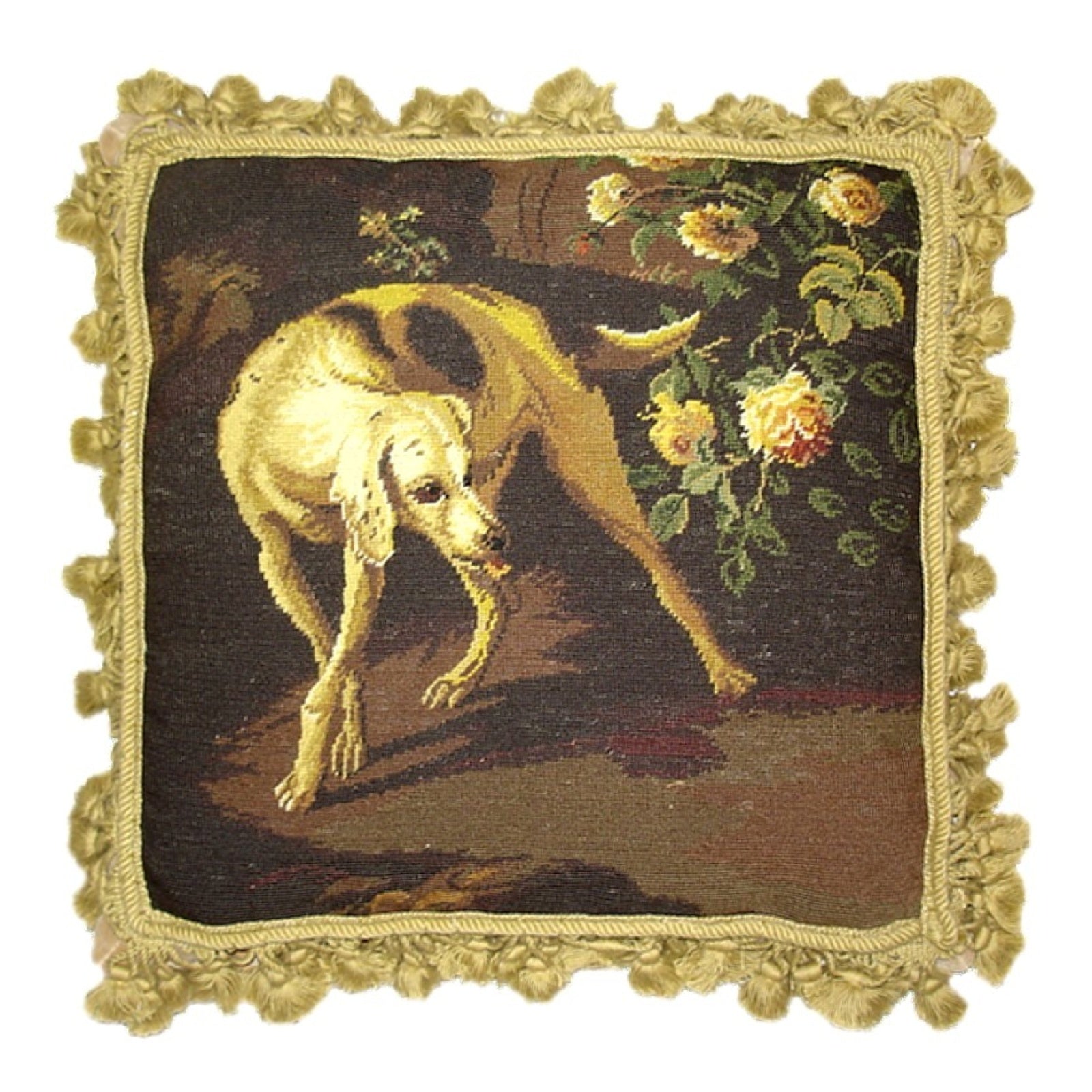 Handmade Wool Needlepoint Pillow Cover - Decorative Throw Cushion Cover - Vintage Floral Embroidery Design brown hunting yellow rose with gold tassels