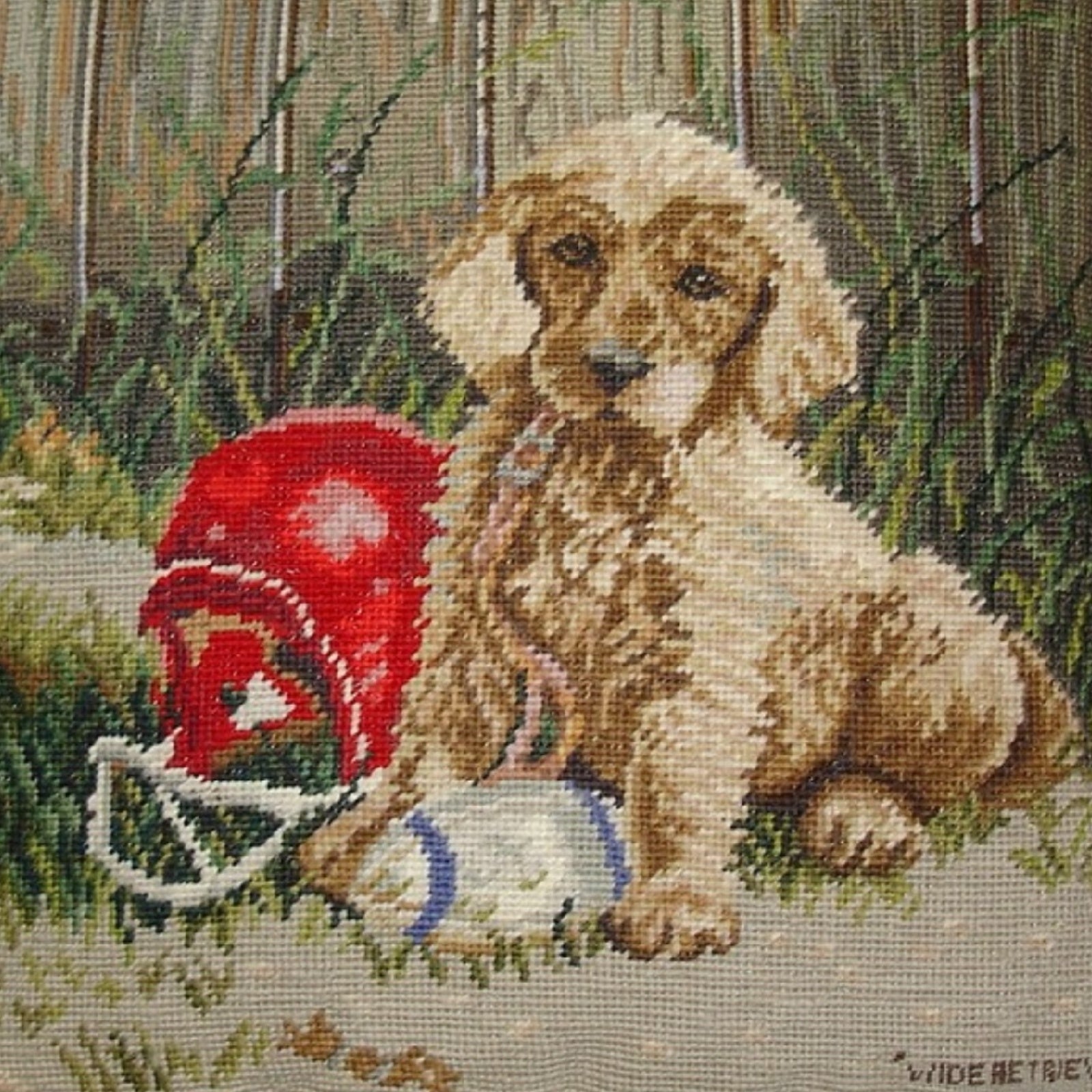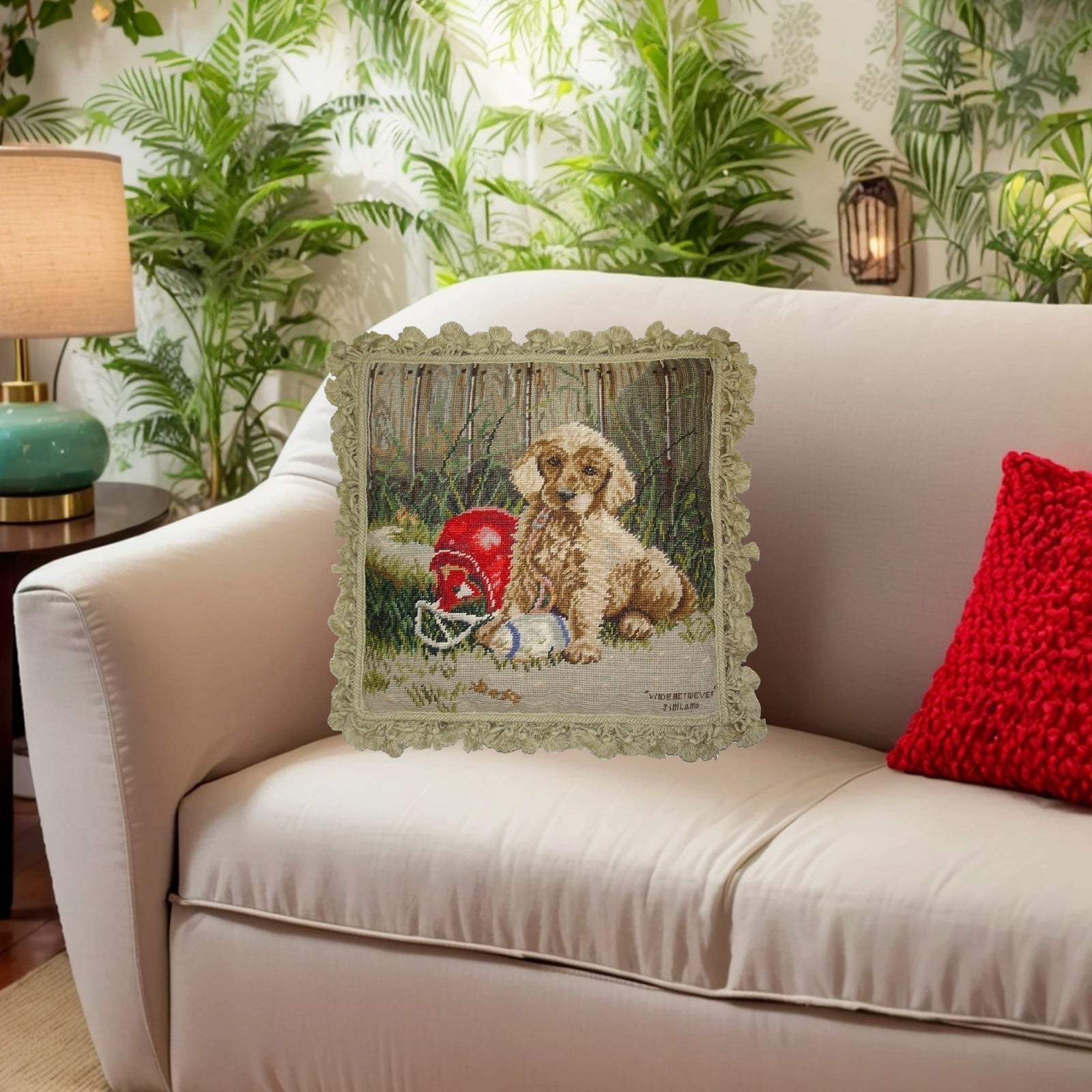 Handmade Wool Needlepoint Pillow Cover - Decorative Throw Cushion Cover - Vintage Floral Embroidery Design Jim Lambs designWide Retriever, &