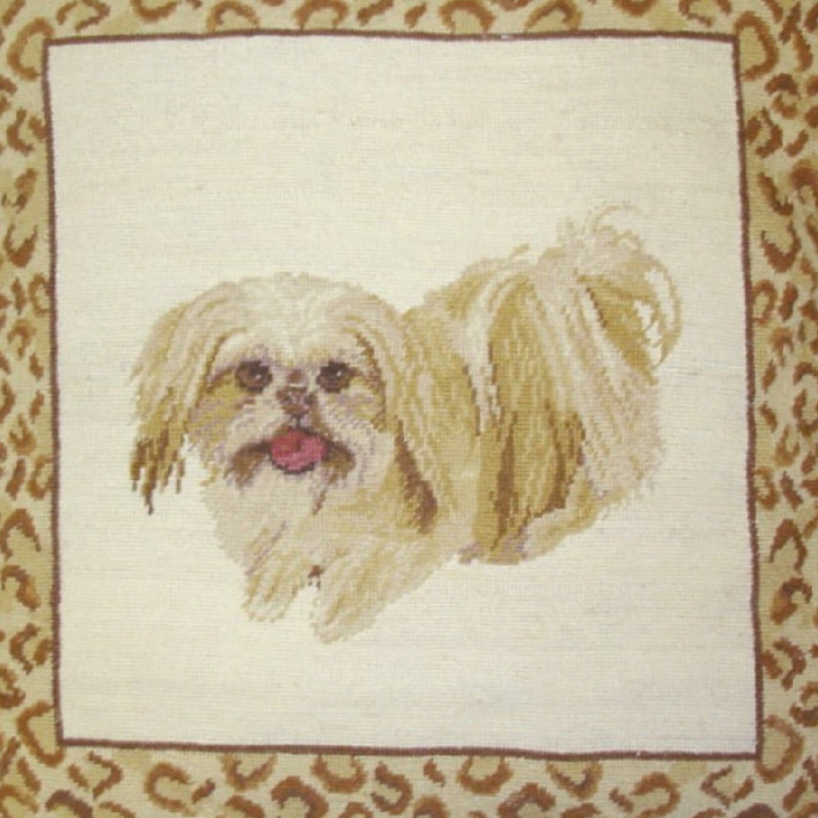 Handmade Wool Needlepoint Pillow Cover - Decorative Throw Cushion Cover - Vintage Floral Embroidery Design playfully Shih-Tzu with animal print frame 2 color tassels
