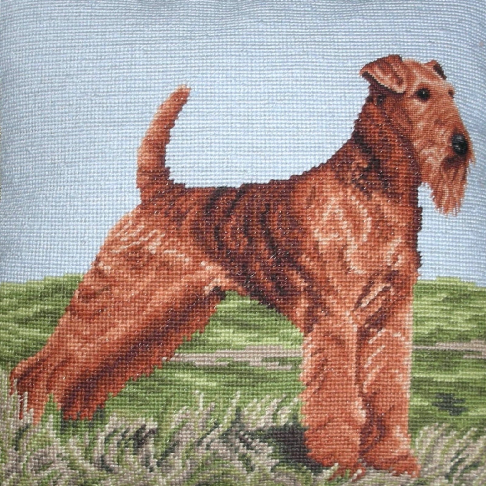 Handmade Wool Needlepoint Pillow Cover - Decorative Throw Cushion Cover - Vintage Floral Embroidery Design Airdale face and rest with tassels