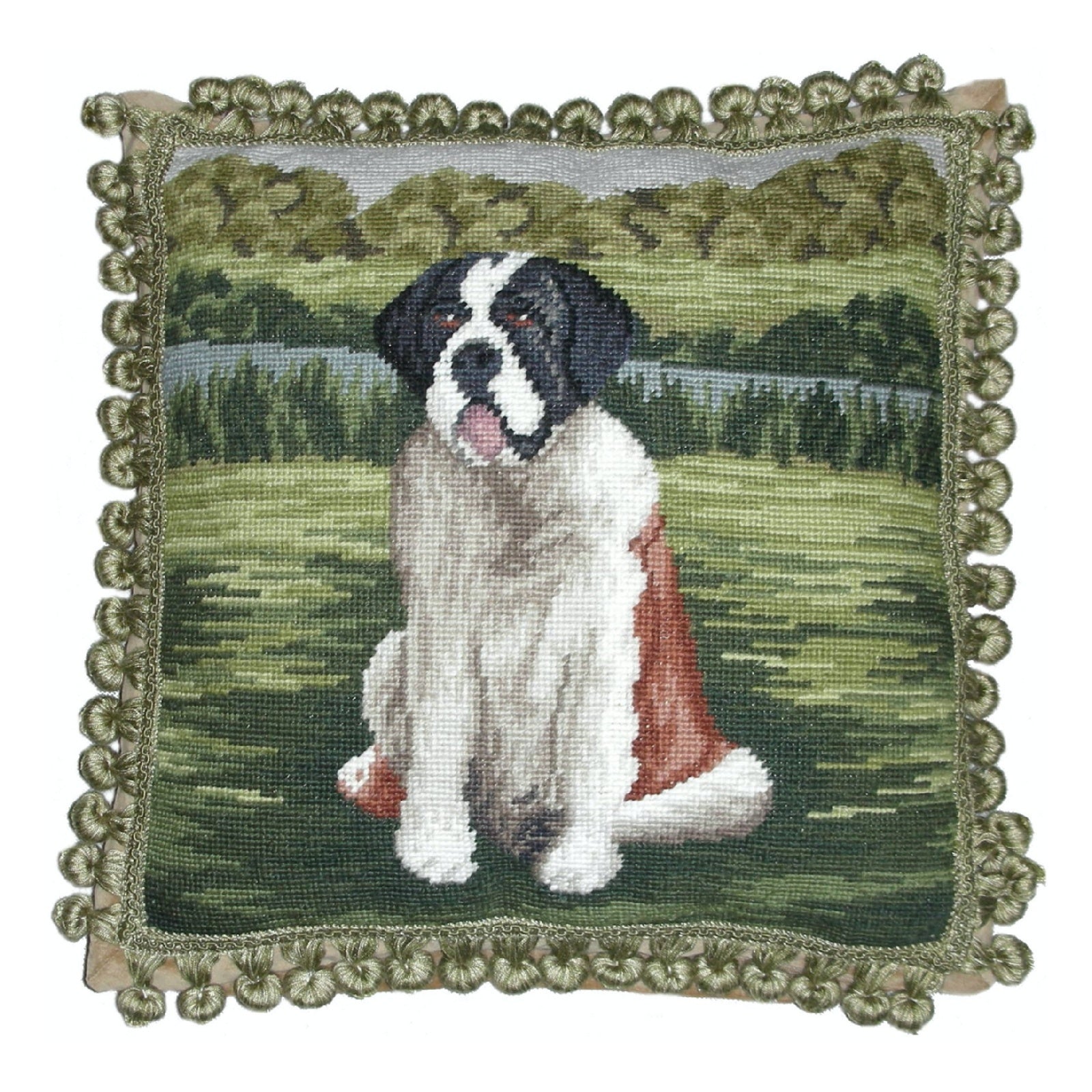 Handmade Wool Needlepoint Pillow Cover - Decorative Throw Cushion Cover - Vintage Floral Embroidery Design St Bernards with tassels