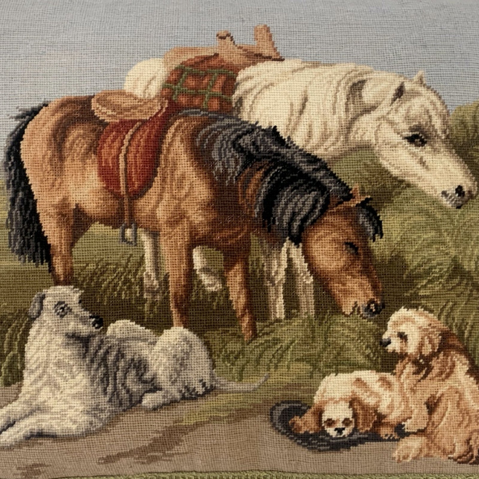 Handmade Wool Needlepoint Pillow Cover - Decorative Throw Cushion Cover - Vintage Floral Embroidery Design Horses & Dogs with 2 color tassels