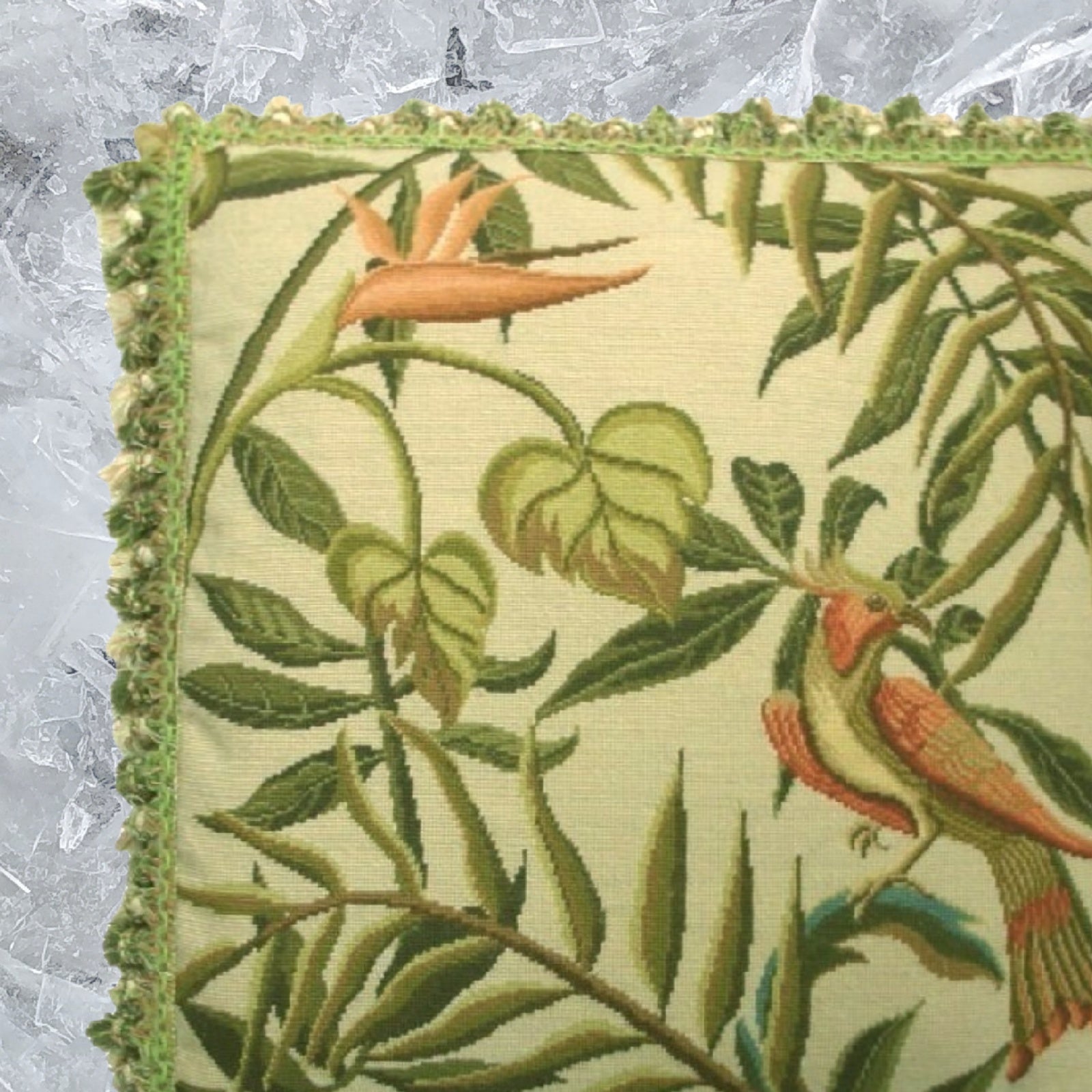 Handmade Wool Needlepoint Pillow Cover - Decorative Throw Cushion Cover - Vintage Floral Embroidery Design birds of Paradise with tassel