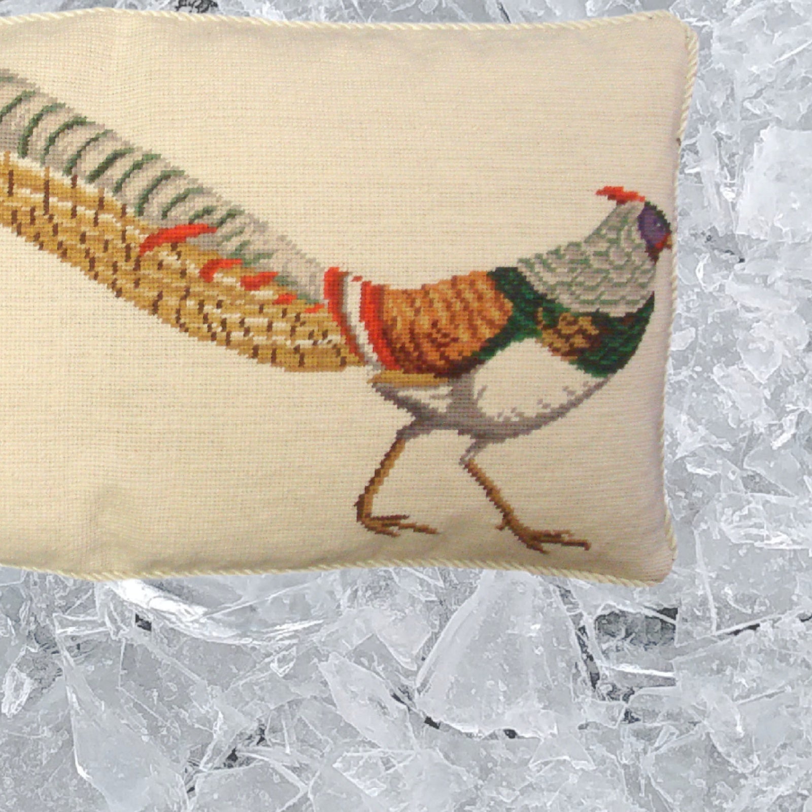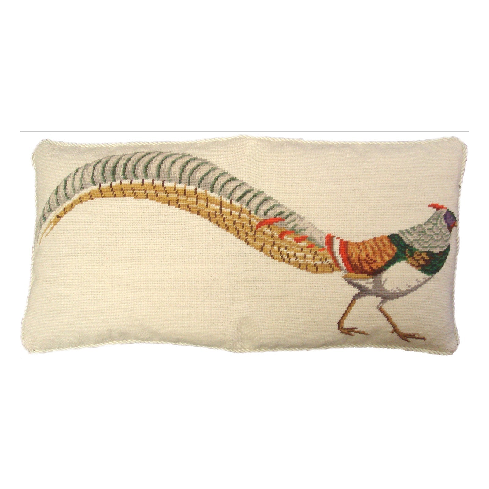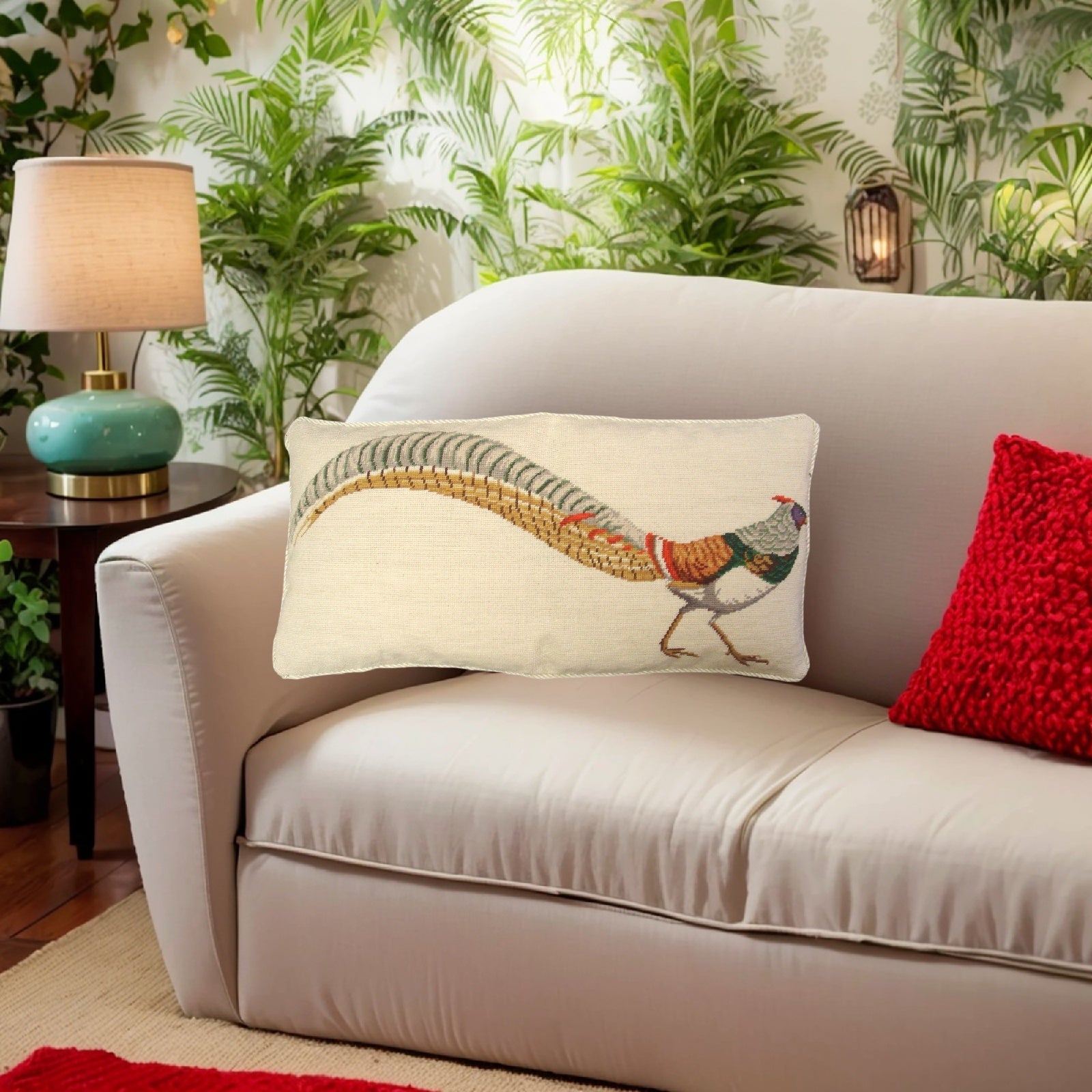 Handmade Wool Needlepoint Pillow Cover - Decorative Throw Cushion Cover - Vintage Floral Embroidery Design pheasant in green/yellow with cording