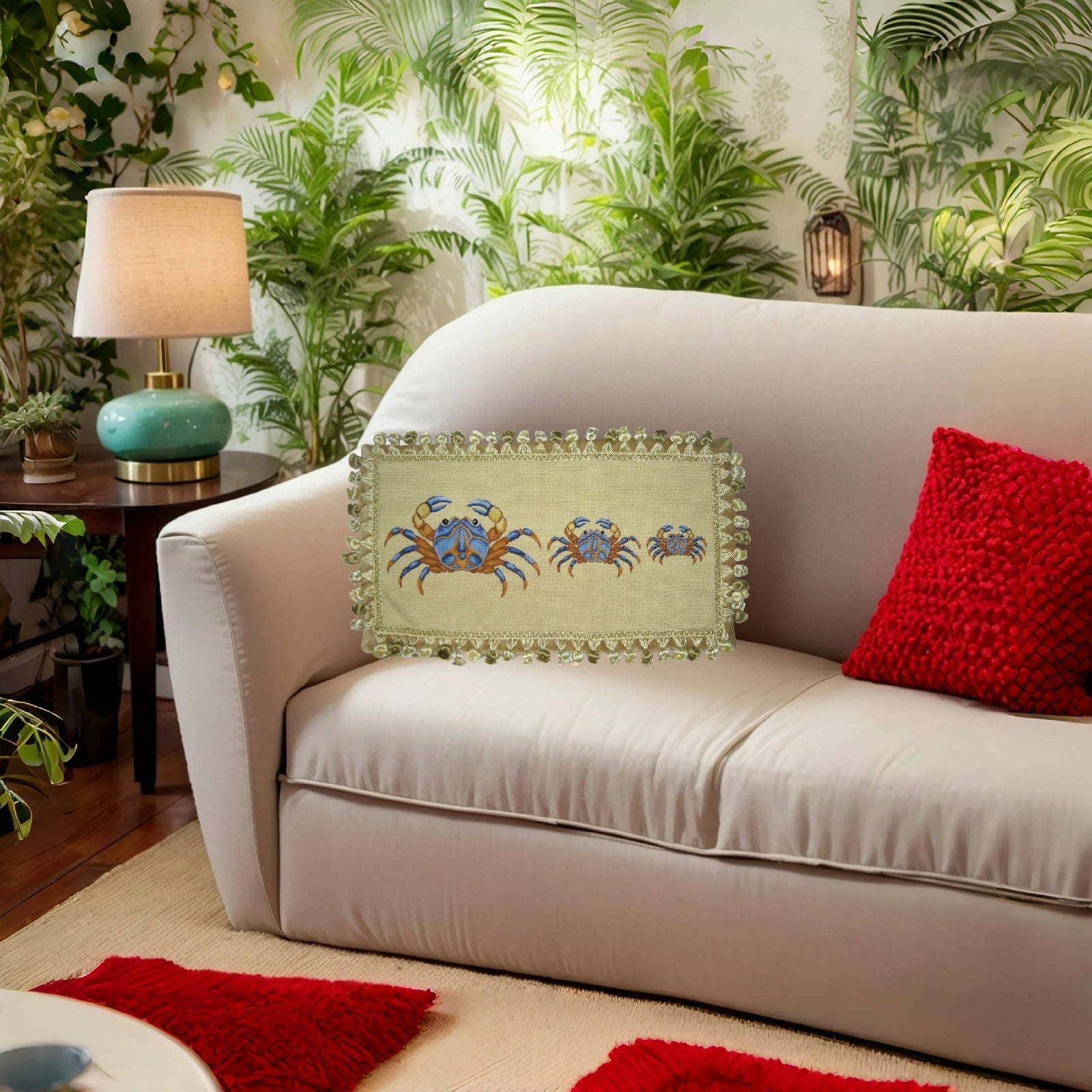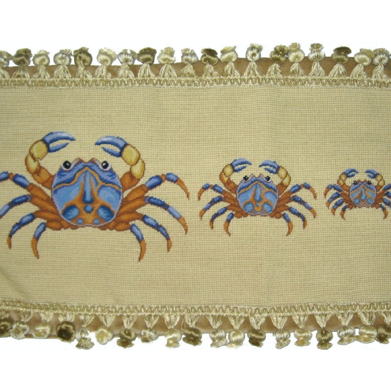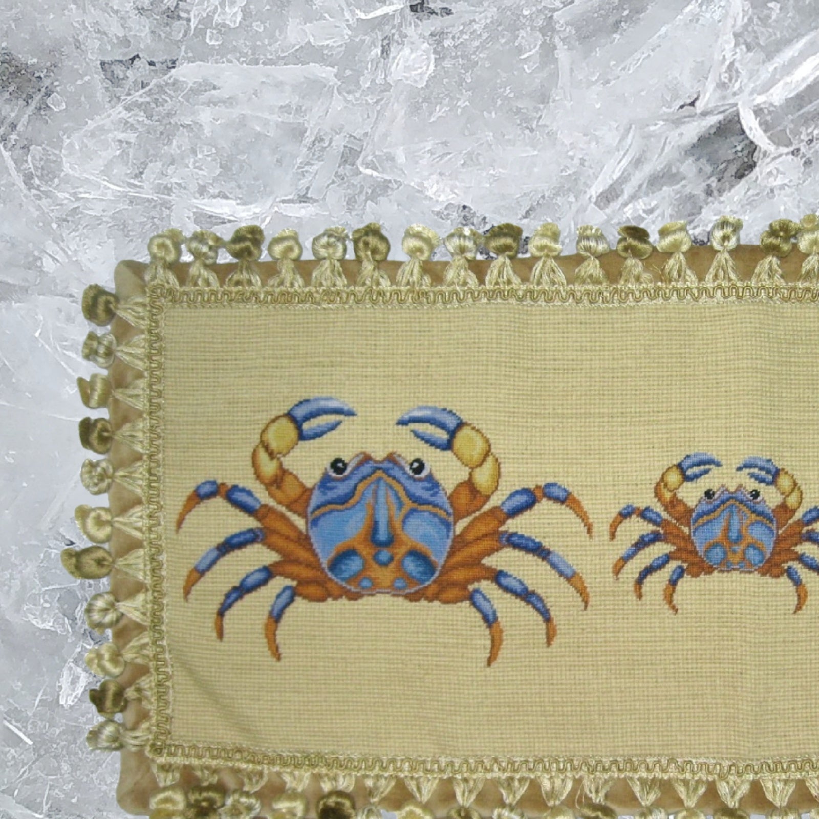 Handmade Wool Needlepoint Pillow Cover - Decorative Throw Cushion Cover - Vintage Floral Embroidery Design 3 blue crabs with tassels