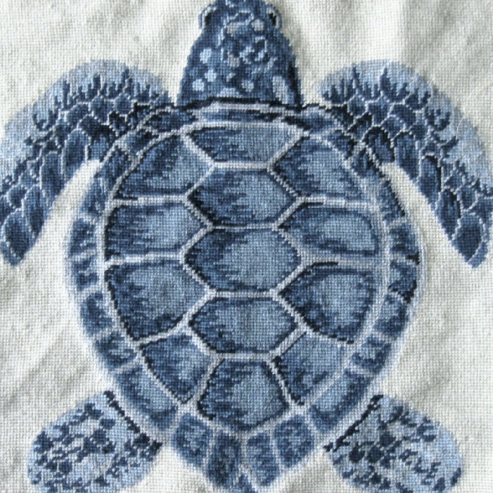 Handmade Wool Needlepoint Pillow Cover - Decorative Throw Cushion Cover - Vintage Floral Embroidery Design dark blue sea turtle cording