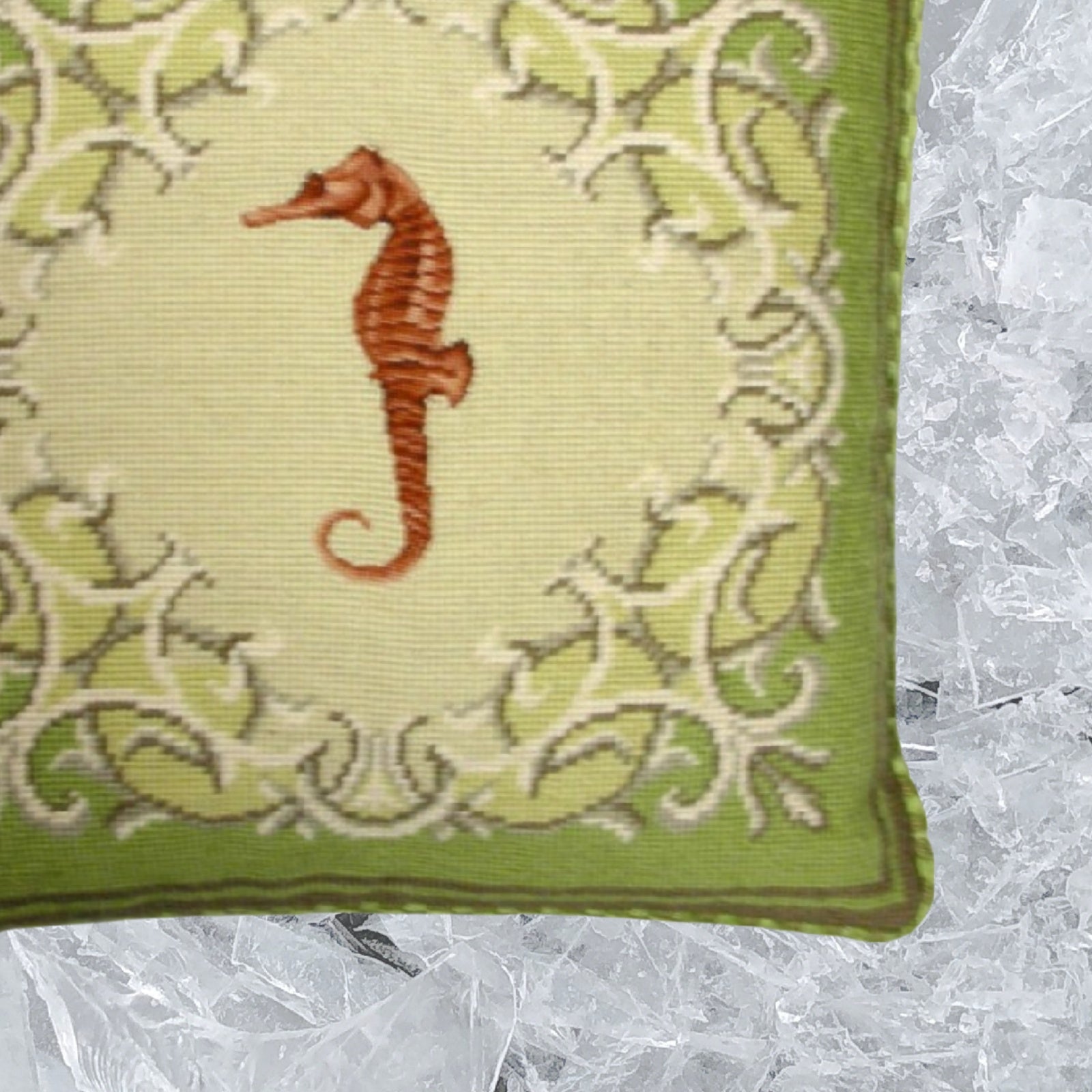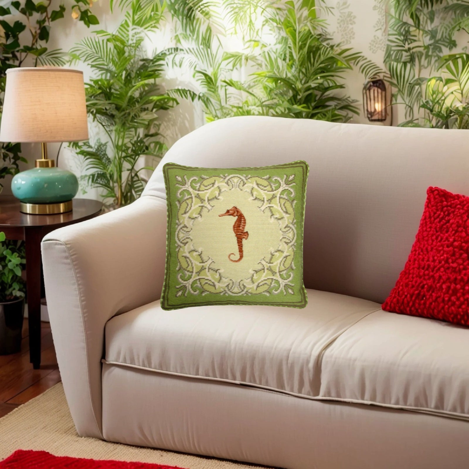 Handmade Wool Needlepoint Pillow Cover - Decorative Throw Cushion Cover - Vintage Floral Embroidery Design seahorse with checker cording