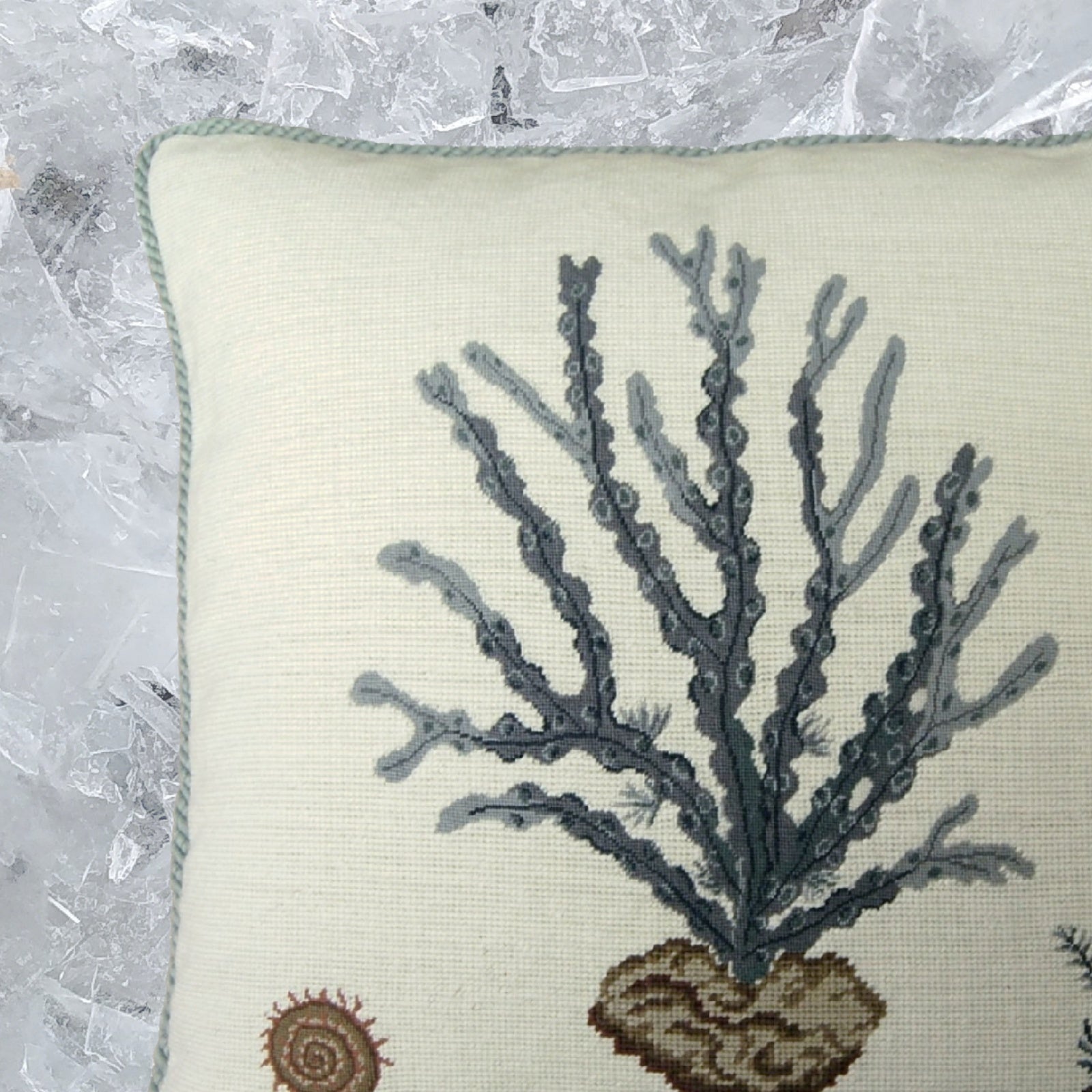 Handmade Wool Needlepoint Pillow Cover - Decorative Throw Cushion Cover - Vintage Floral Embroidery Design blue water weed in blue with blue cording