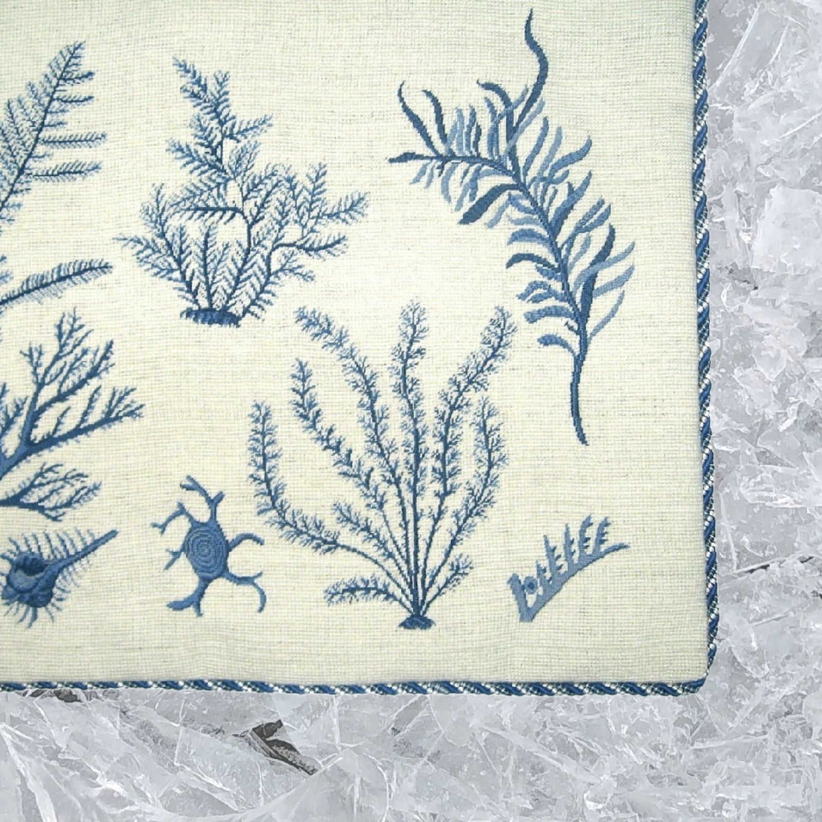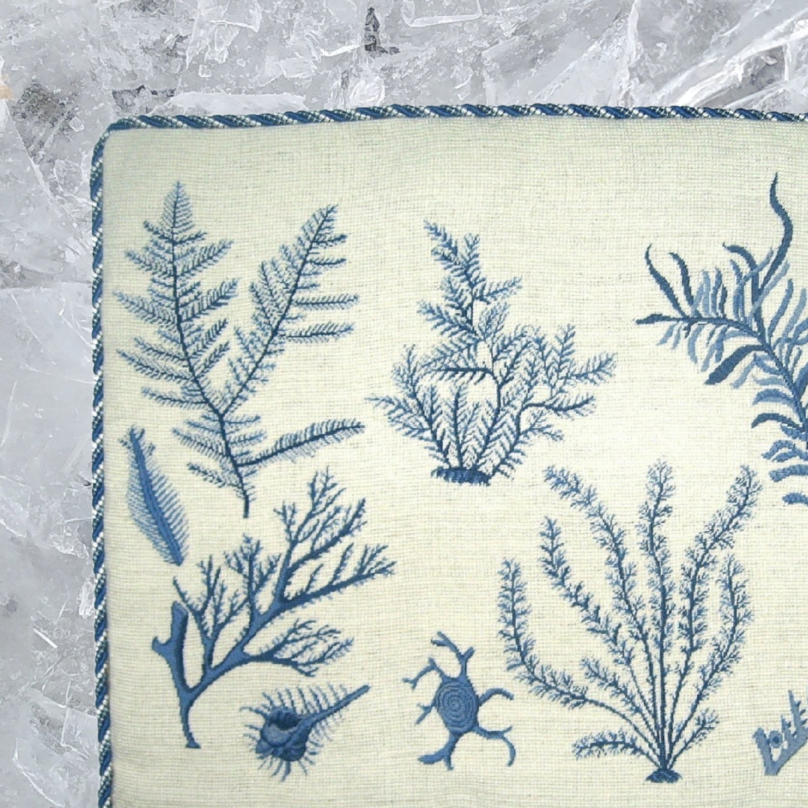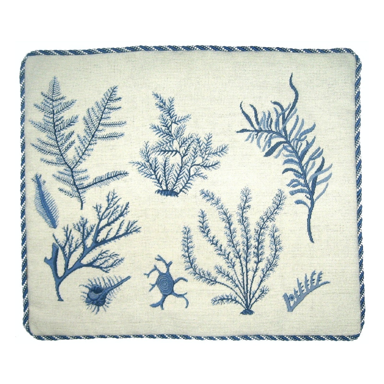 Handmade Wool Needlepoint Pillow Cover - Decorative Throw Cushion Cover - Vintage Floral Embroidery Design blue group seaweeds with cording