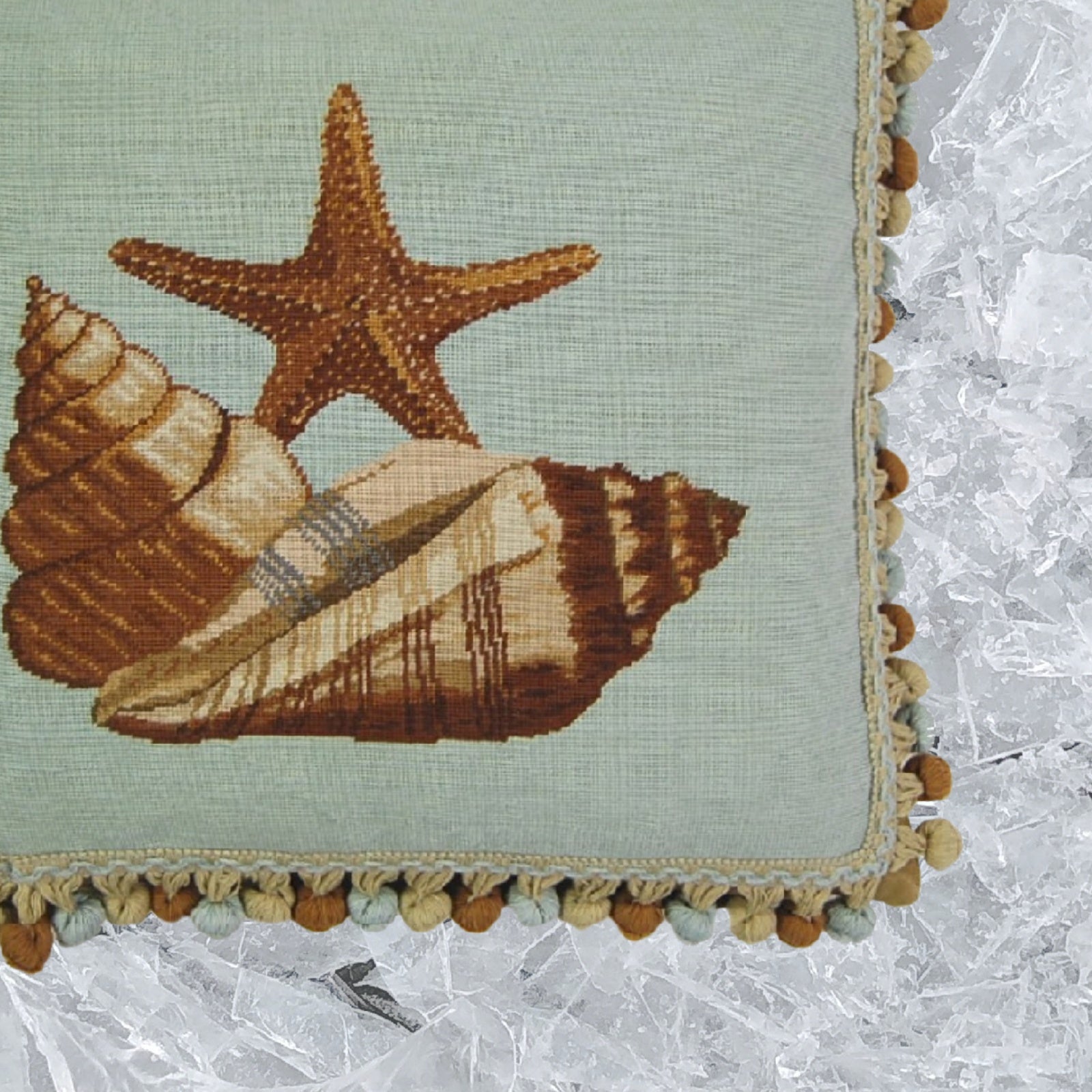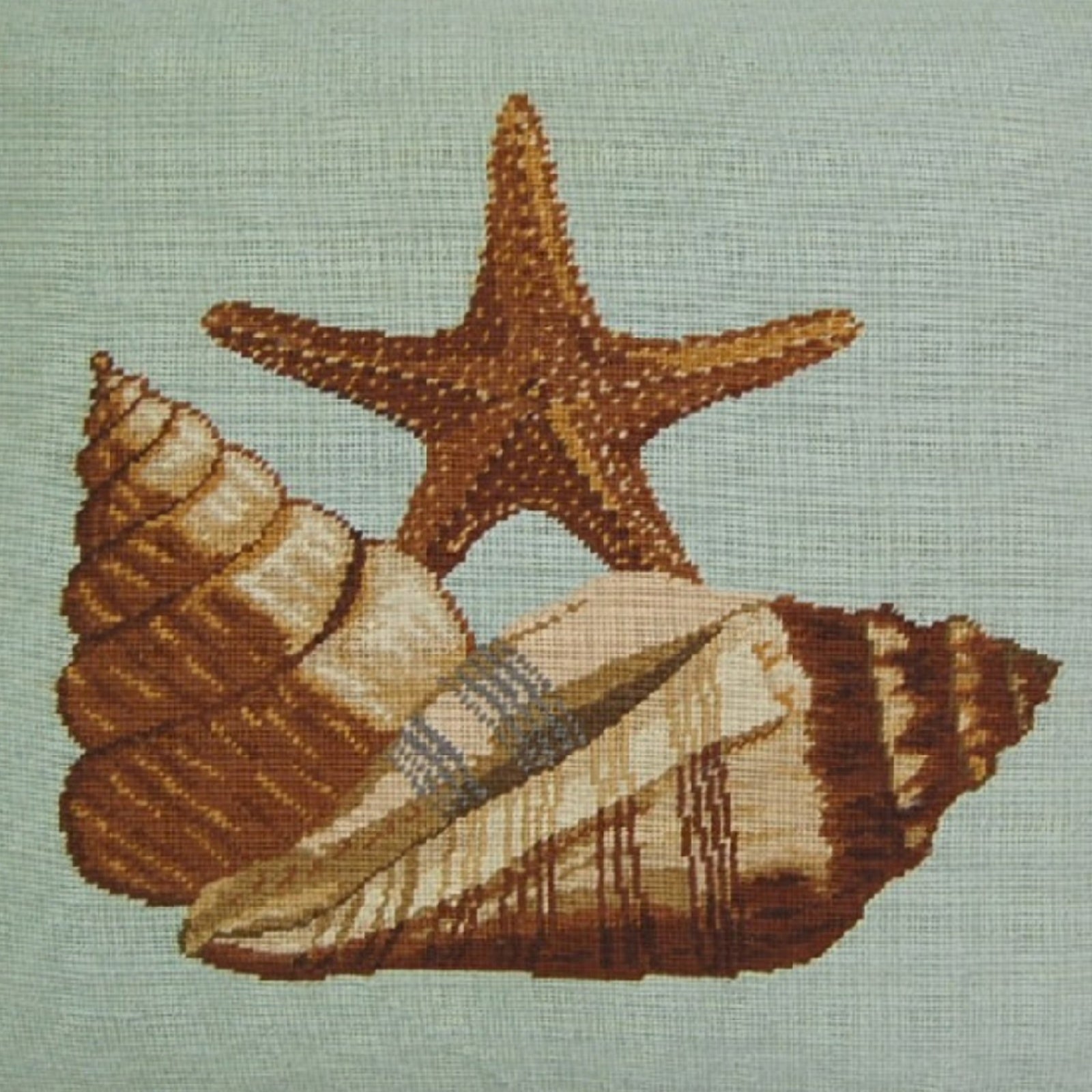 Handmade Wool Needlepoint Pillow Cover - Decorative Throw Cushion Cover - Vintage Floral Embroidery Design blue background with brown sea star fish and sea shells with tassel