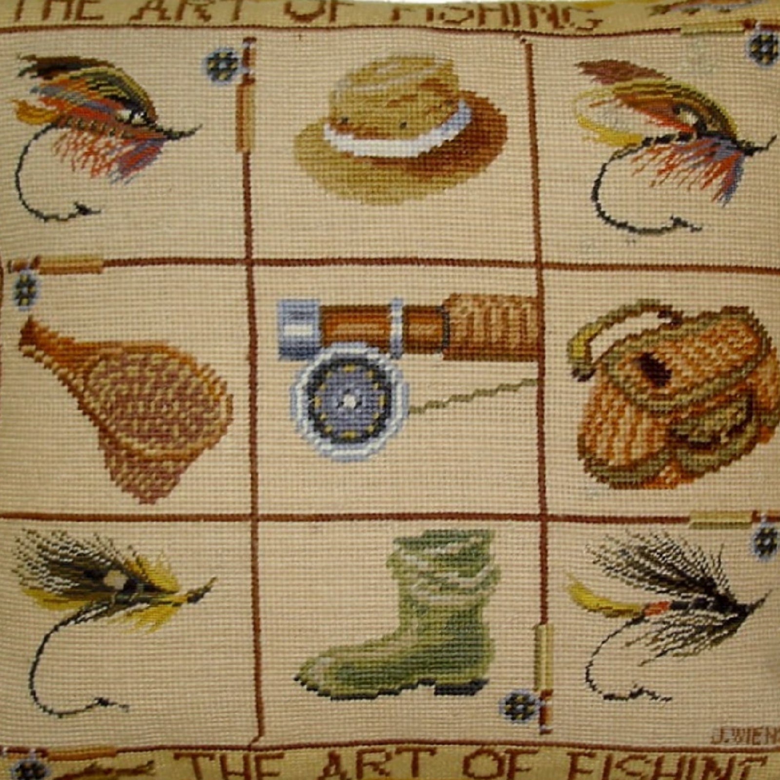 Handmade Wool Needlepoint Pillow Cover - Decorative Throw Cushion Cover - Vintage Floral Embroidery Design James Wienss designThe art of fishing, &