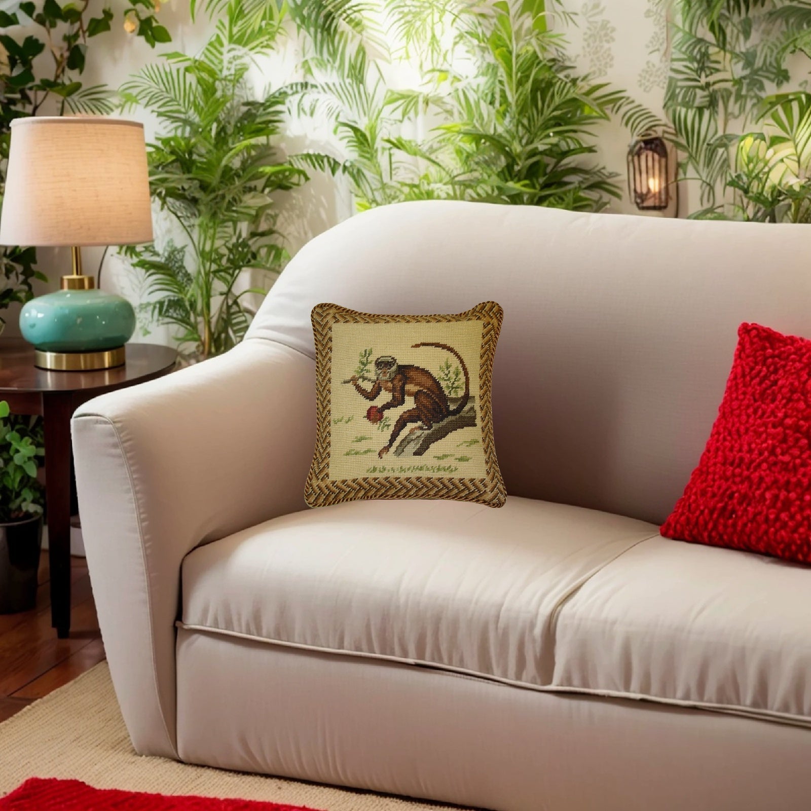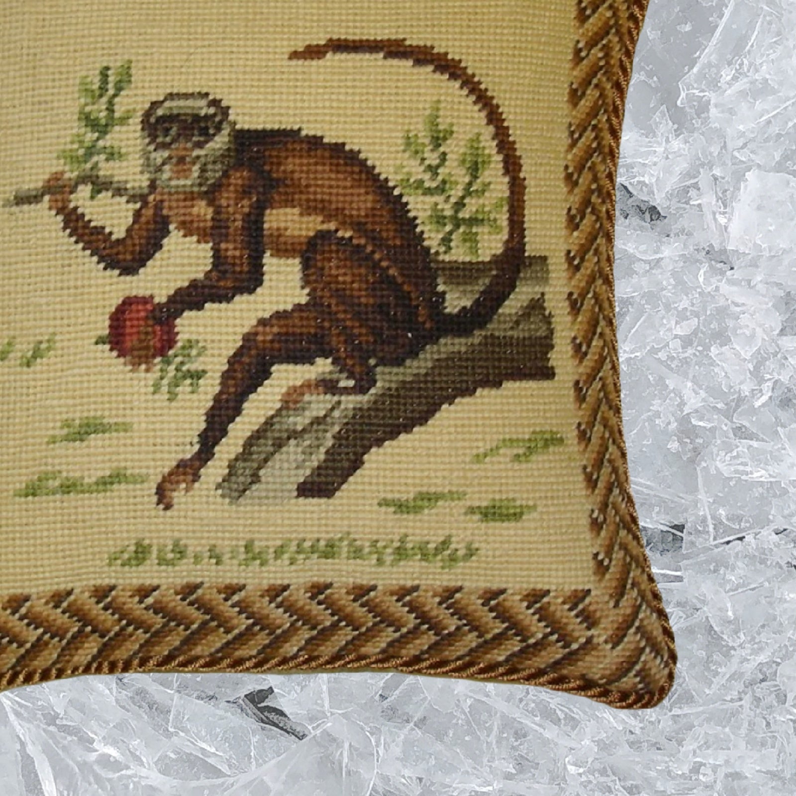 Handmade Wool Needlepoint Pillow Cover - Decorative Throw Cushion Cover - Vintage Floral Embroidery Design monkey carry leaves with cording
