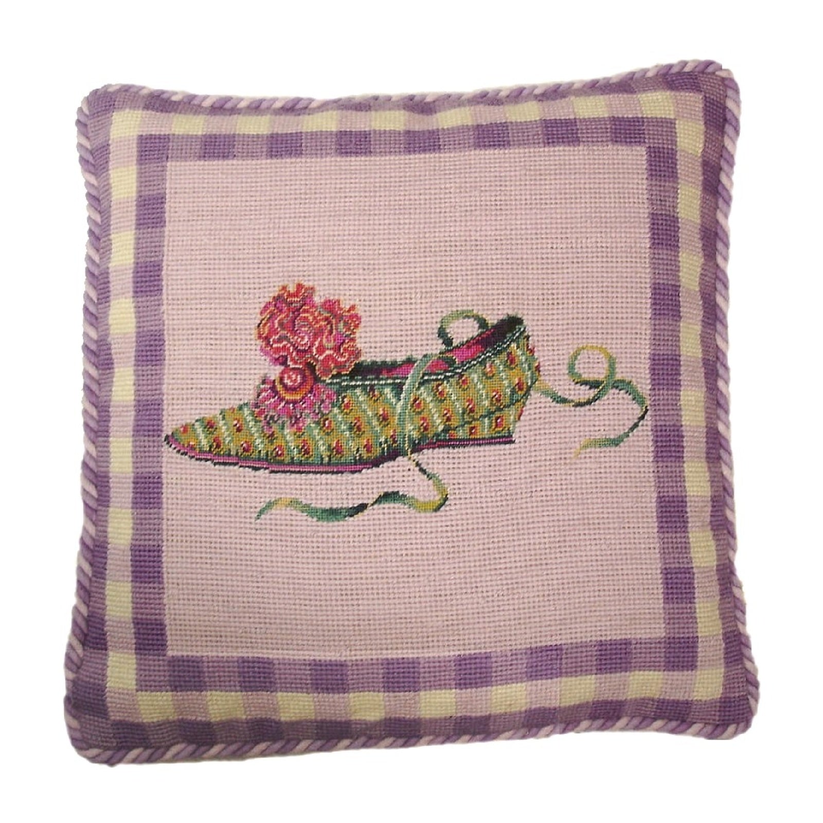 Handmade Wool Needlepoint Pillow Cover - Decorative Throw Cushion Cover - Vintage Floral Embroidery Design flat show lavender background with 2 color cording