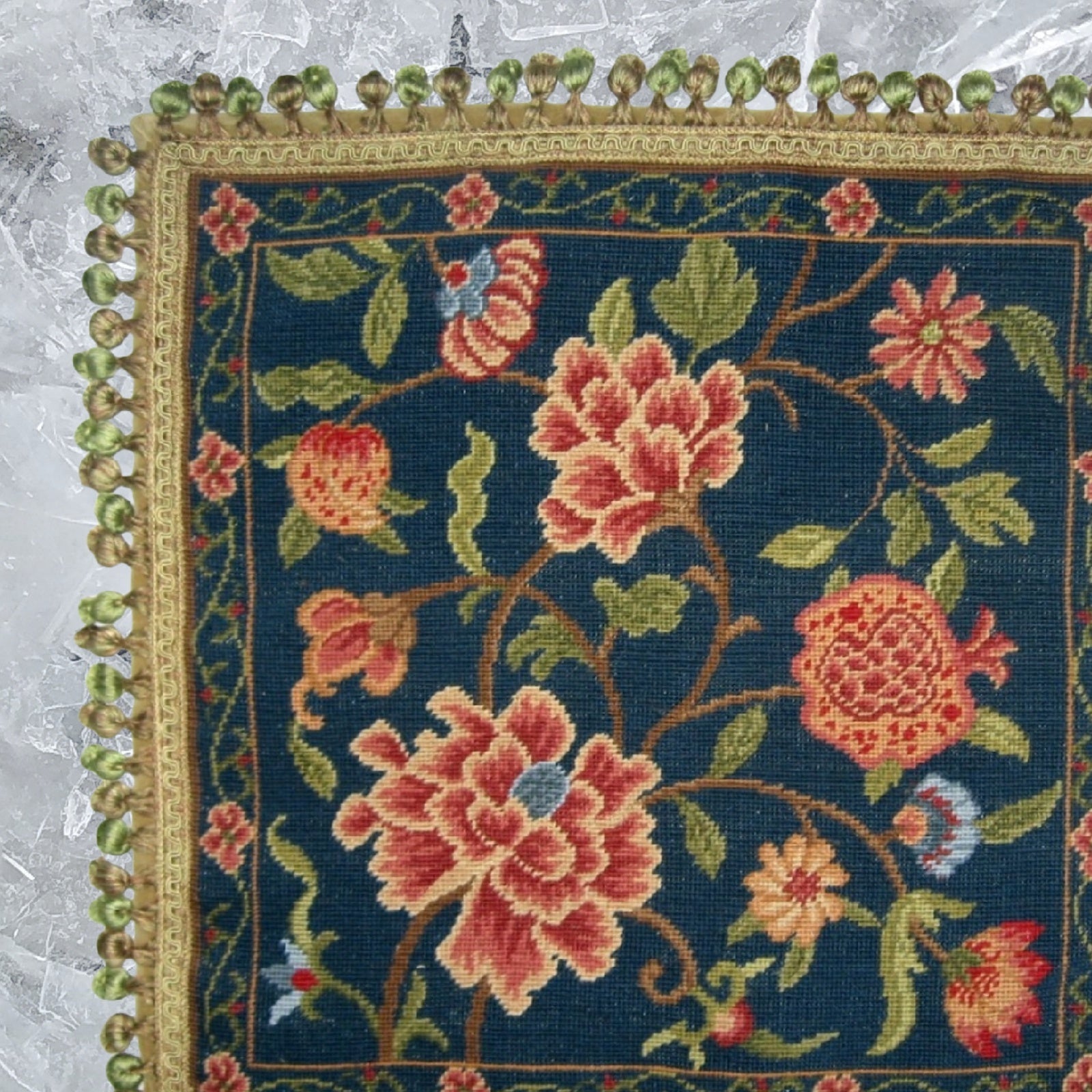Handmade Wool Needlepoint Pillow Cover - Decorative Throw Cushion Cover - Vintage Floral Embroidery Design navy blue back blooming peonies with tassels