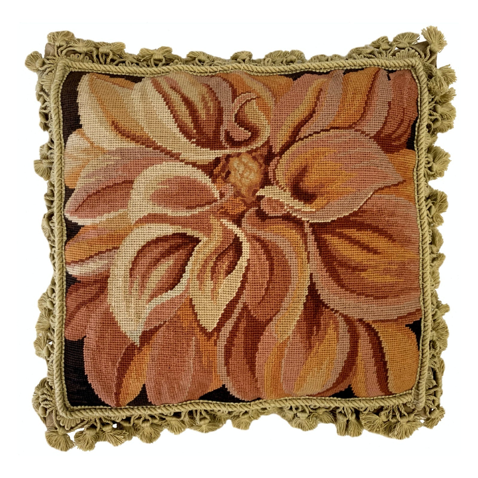 Handmade Wool Needlepoint Pillow Cover - Decorative Throw Cushion Cover - Vintage Floral Embroidery Design on orange chrysanthemum with tassels