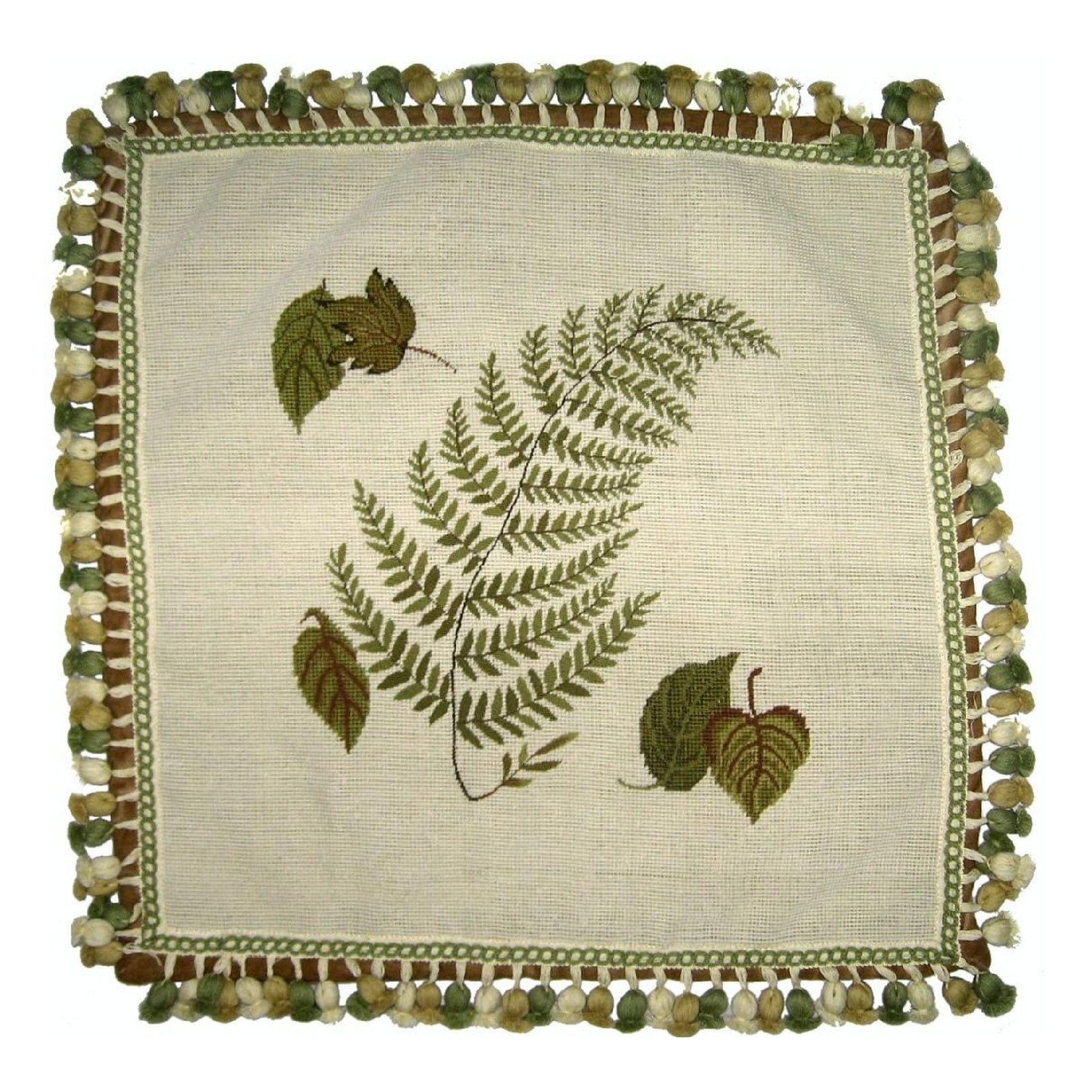 Handmade Wool Needlepoint Pillow Cover - Decorative Throw Cushion Cover - Vintage Floral Embroidery Design fern, leaves with tassels