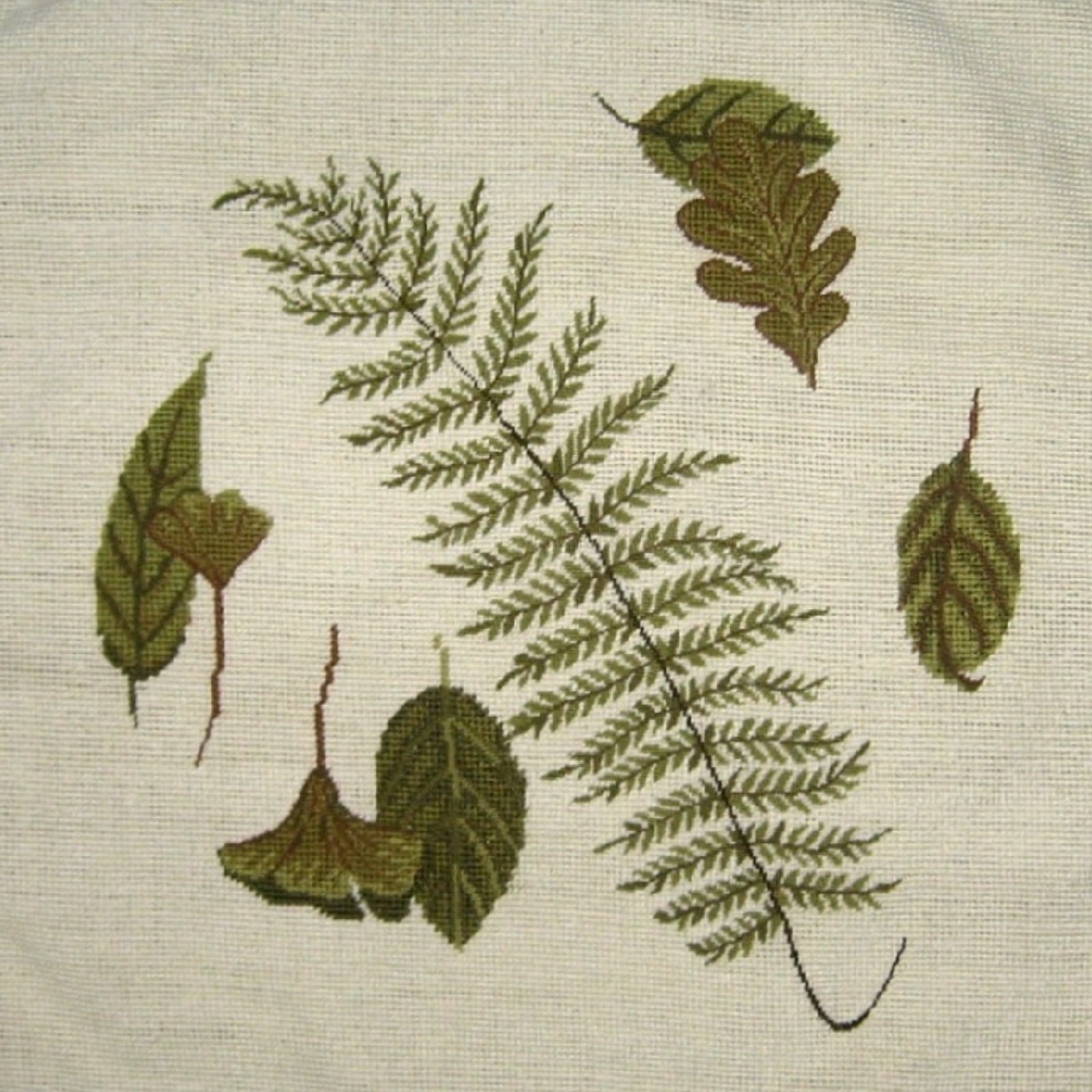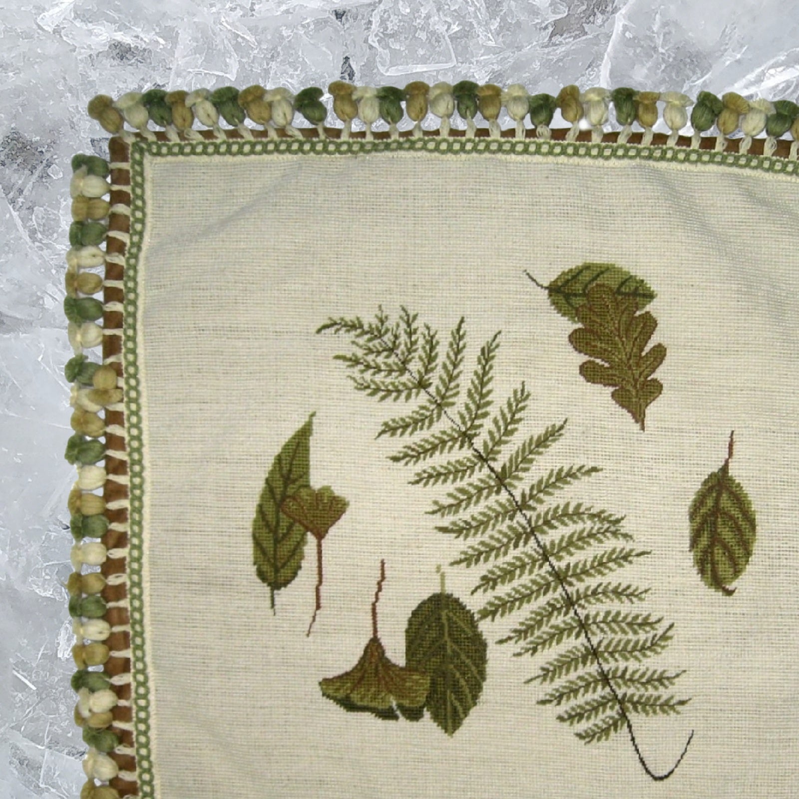 Handmade Wool Needlepoint Pillow Cover - Decorative Throw Cushion Cover - Vintage Floral Embroidery Design fern, leaves with 3 color tassels