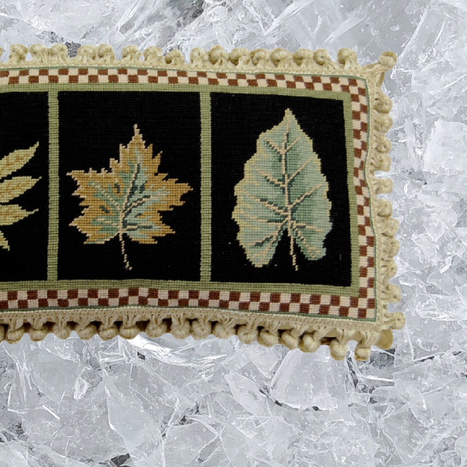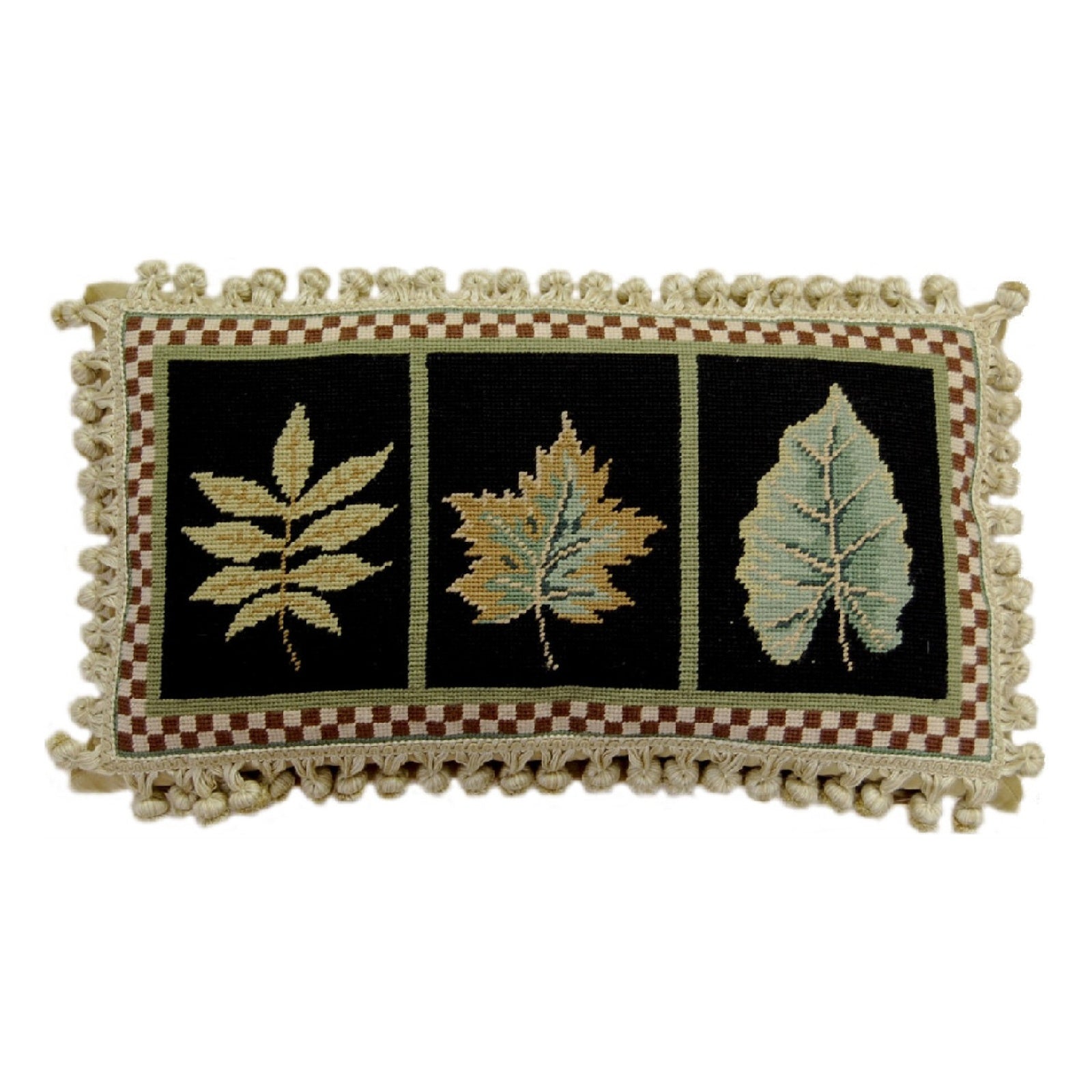 Handmade Wool Needlepoint Pillow Cover - Decorative Throw Cushion Cover - Vintage Floral Embroidery Design 3, S-L, leaves black background with tassels