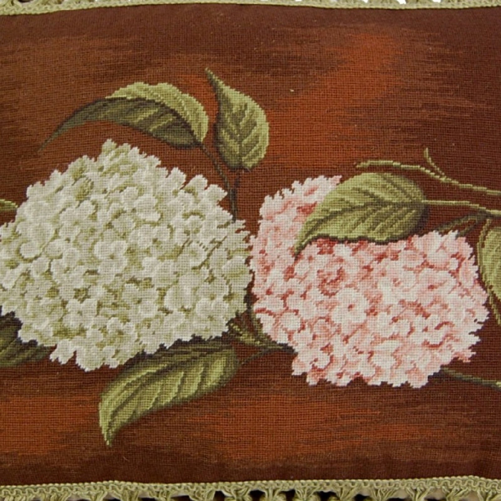 Handmade Wool Needlepoint Pillow Cover - Decorative Throw Cushion Cover - Vintage Floral Embroidery Design brown background pink & green hydrangea with tassels