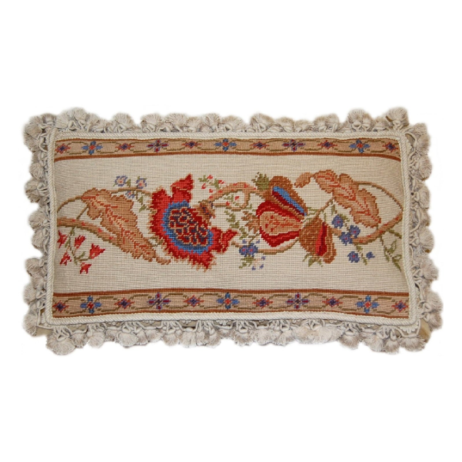 Handmade Wool Needlepoint Pillow Cover - Decorative Throw Cushion Cover - Vintage Floral Embroidery Design ginger flower with nature tassels