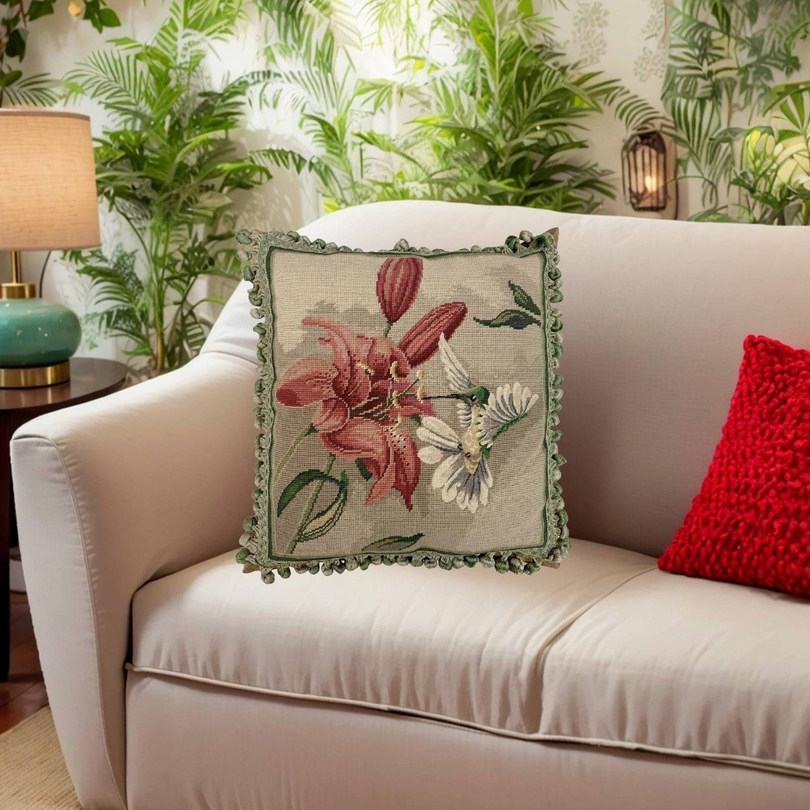 Handmade Wool Needlepoint Pillow Cover - Decorative Throw Cushion Cover - Vintage Floral Embroidery Designhumming bird at side of pink lily with 2 color tassel