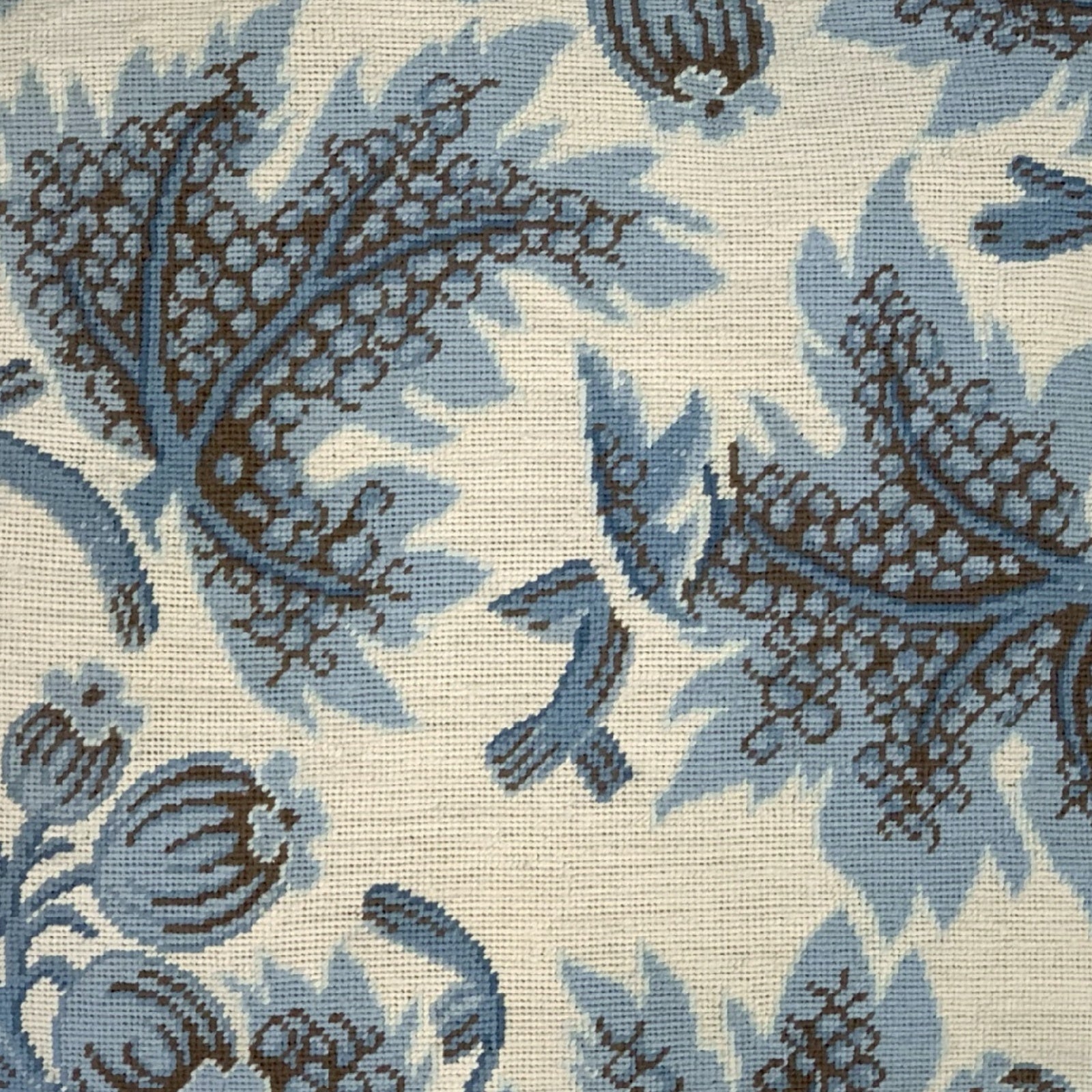 Handmade Wool Needlepoint Pillow Cover - Decorative Throw Cushion Cover - Vintage Floral Embroidery Design blue grapes leaves ivory background with tassels