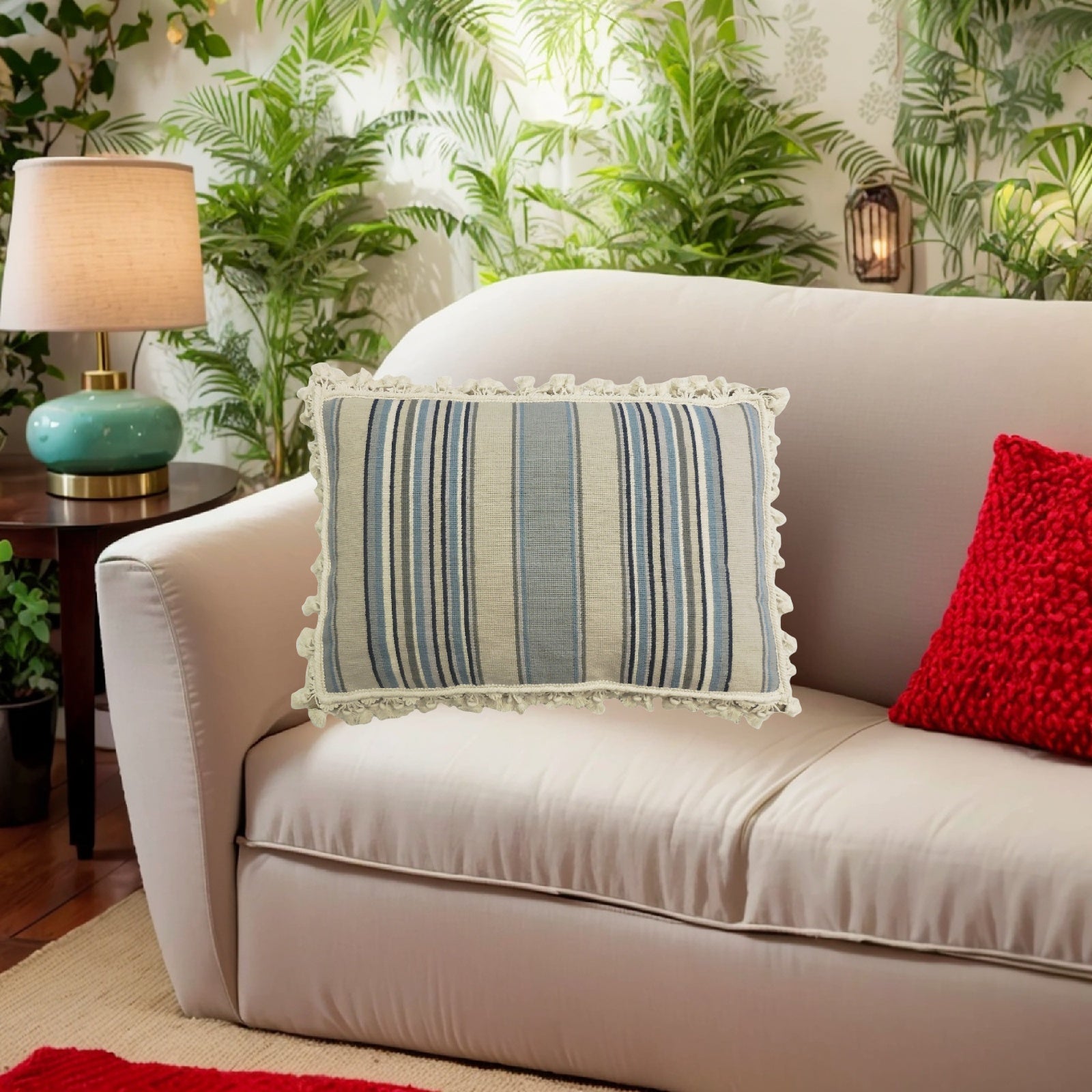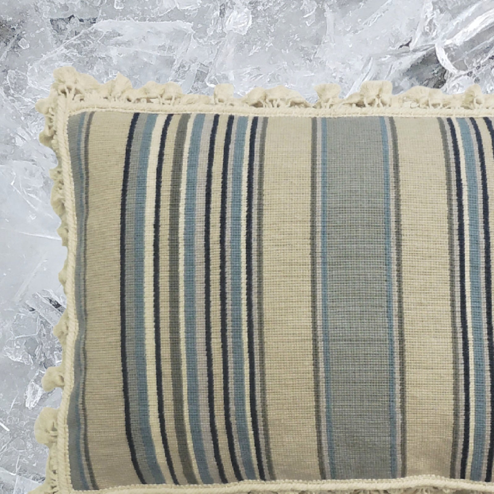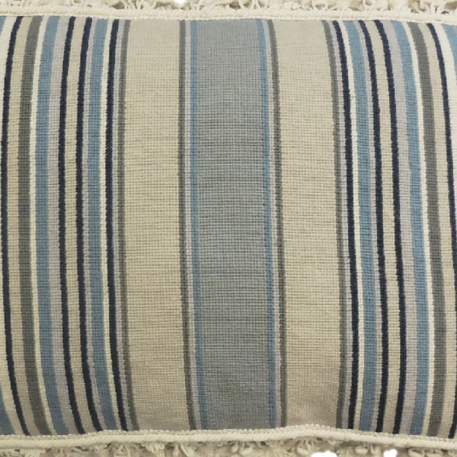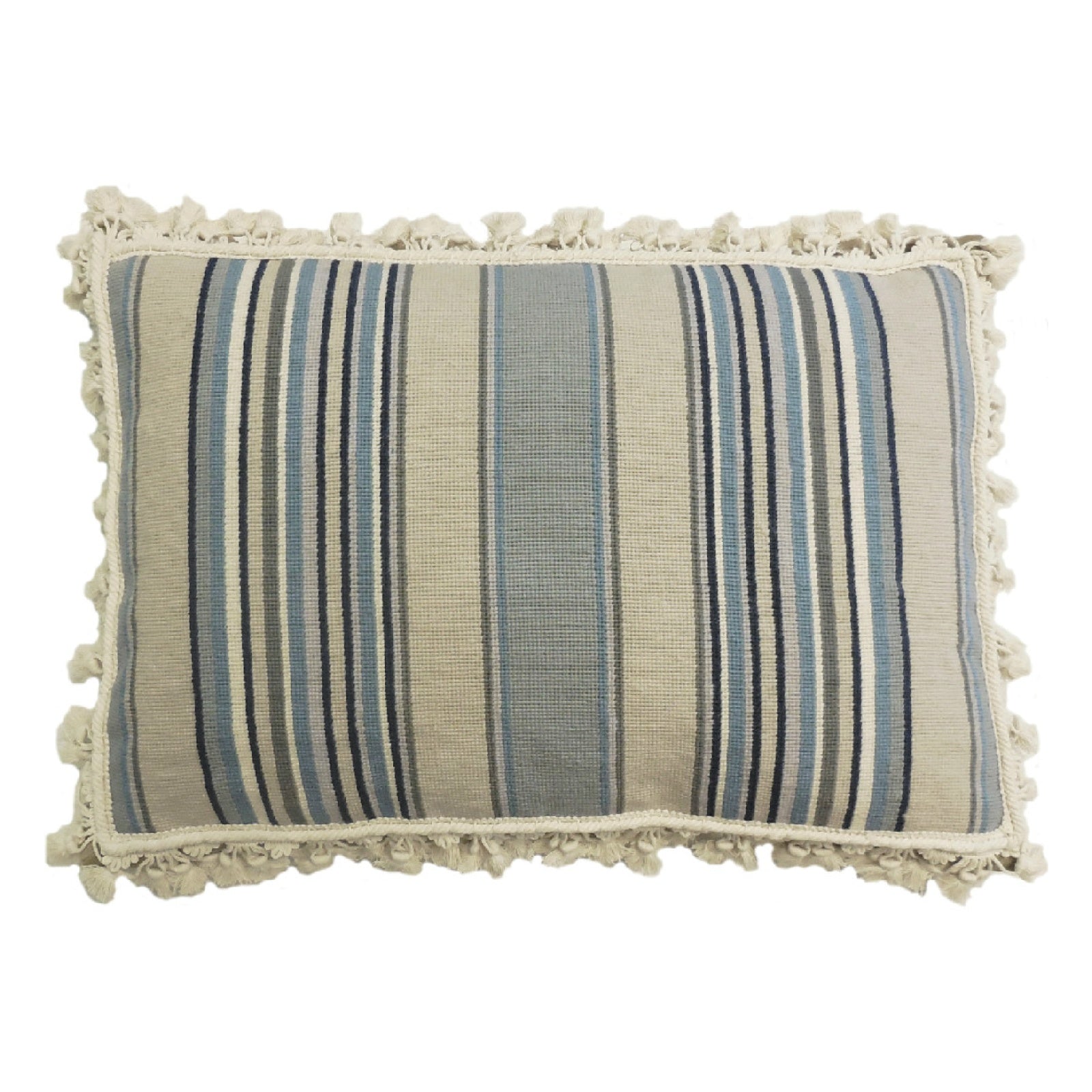 Handmade Wool Needlepoint Pillow Cover - Decorative Throw Cushion Cover - Vintage Floral Embroidery Design strips in blue/sand/navy/ivory with tassels