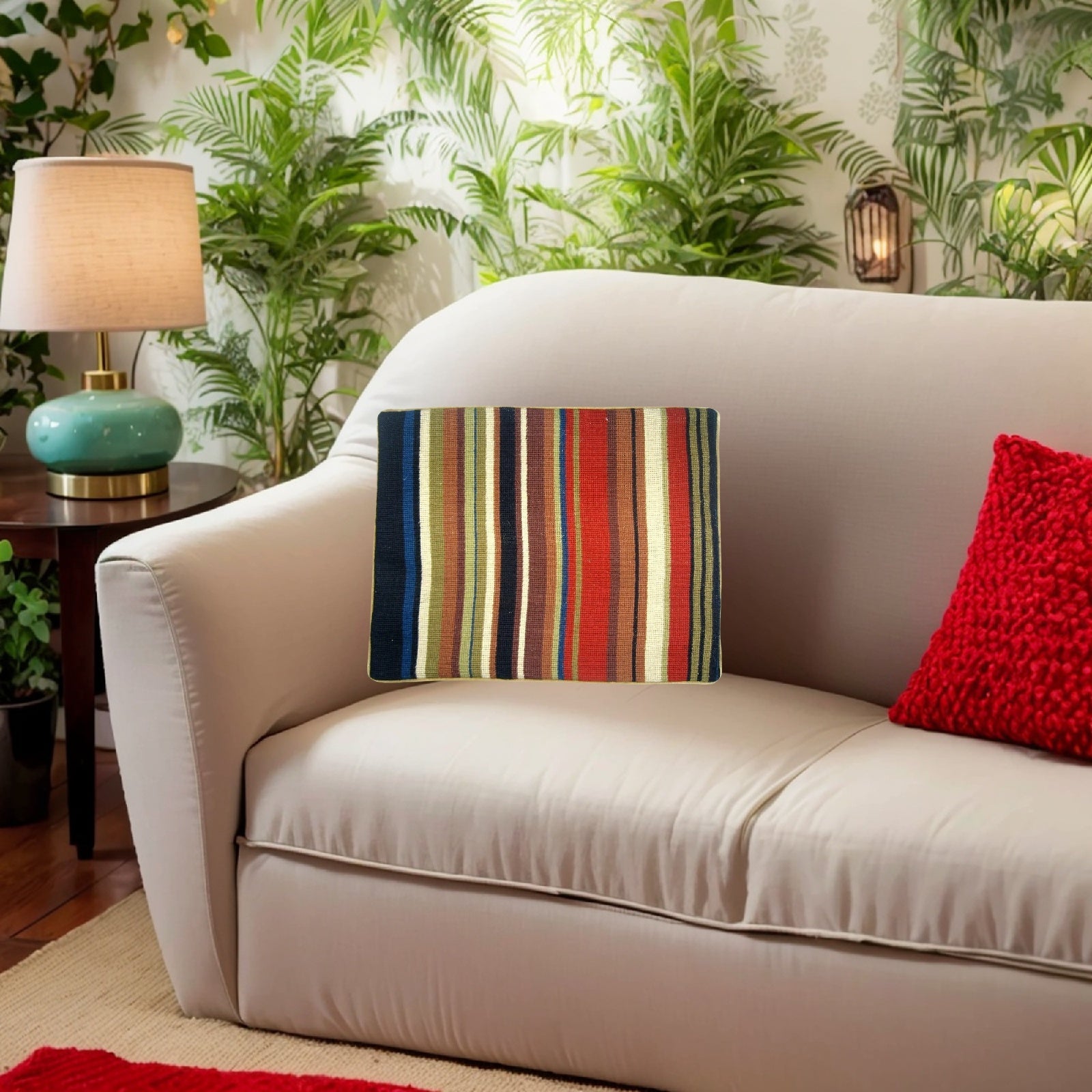 Handmade Wool Needlepoint Pillow Cover - Decorative Throw Cushion Cover - Vintage Floral Embroidery Design autumn rain in red, brown, blue, olive, ivory