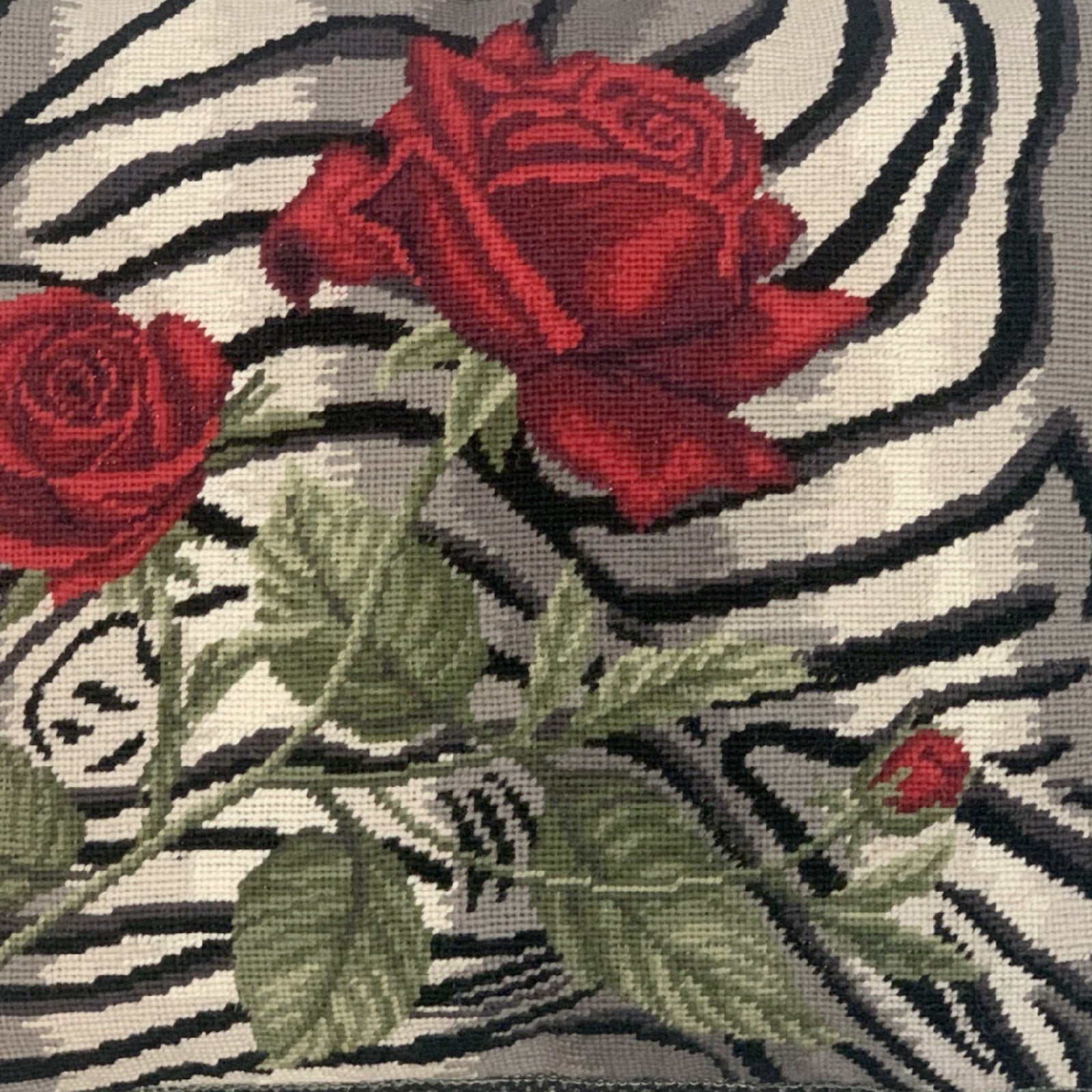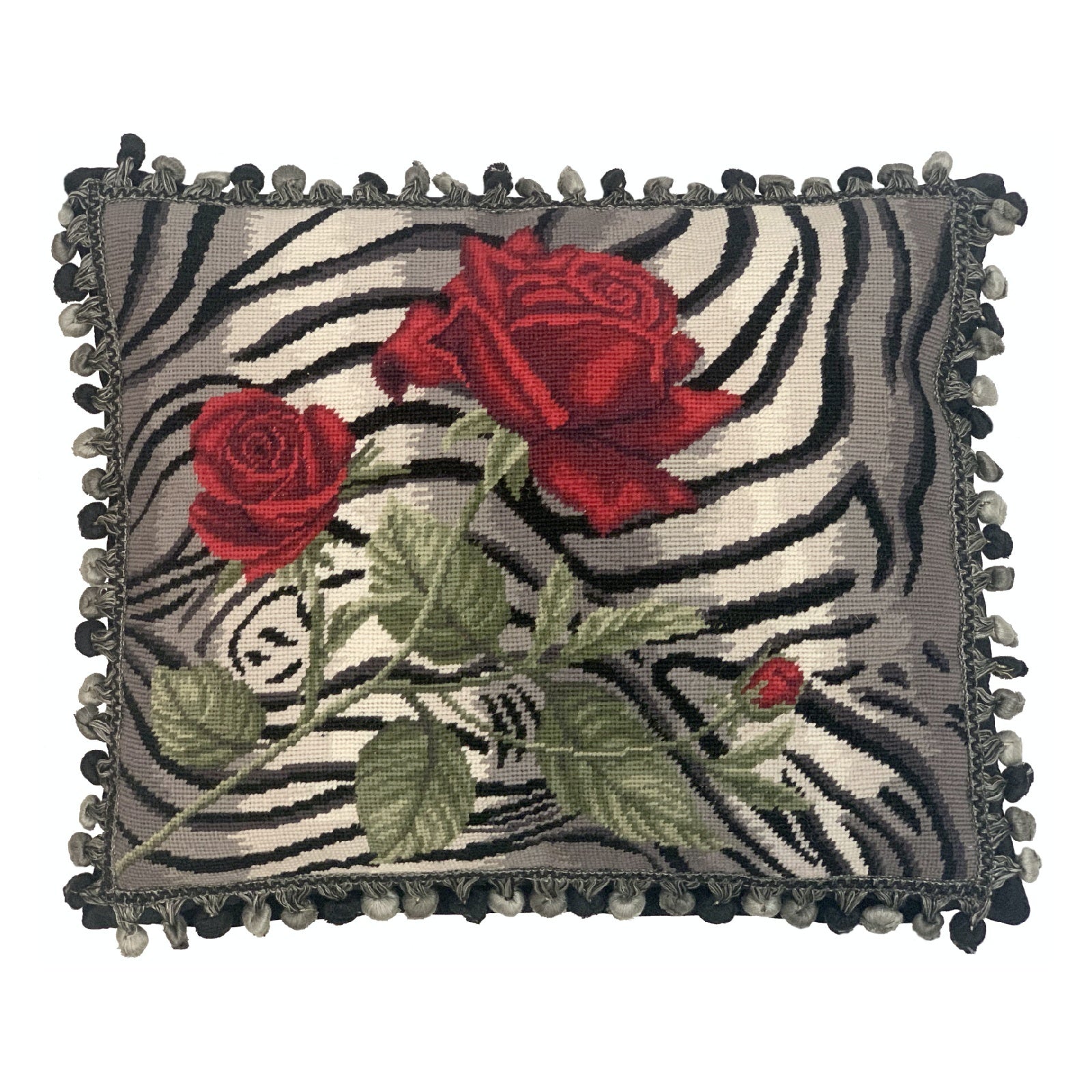 Handmade Wool Needlepoint Pillow Cover - Decorative Throw Cushion Cover - Vintage Floral Embroidery Design B/W tiger print red rose with 3 color tassel