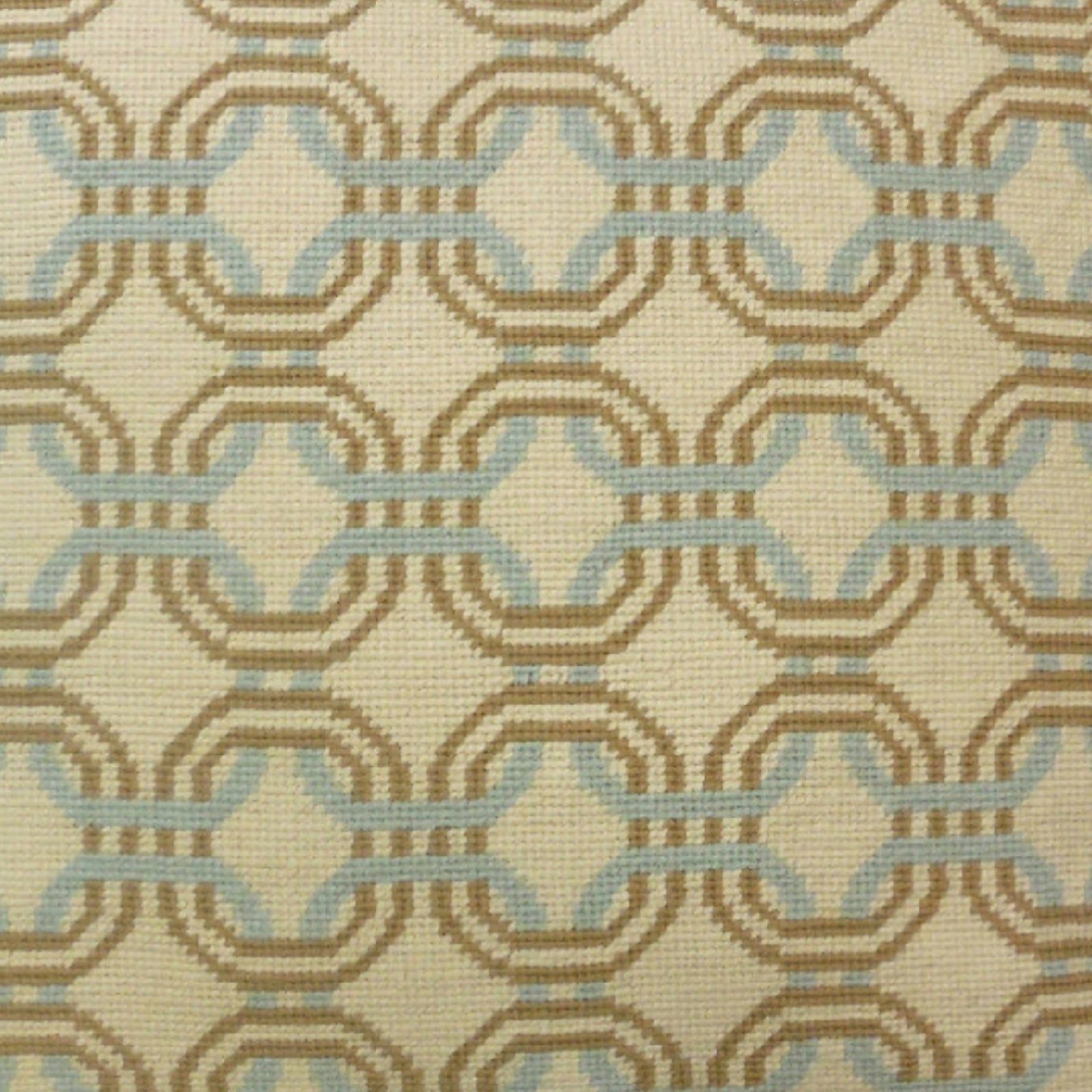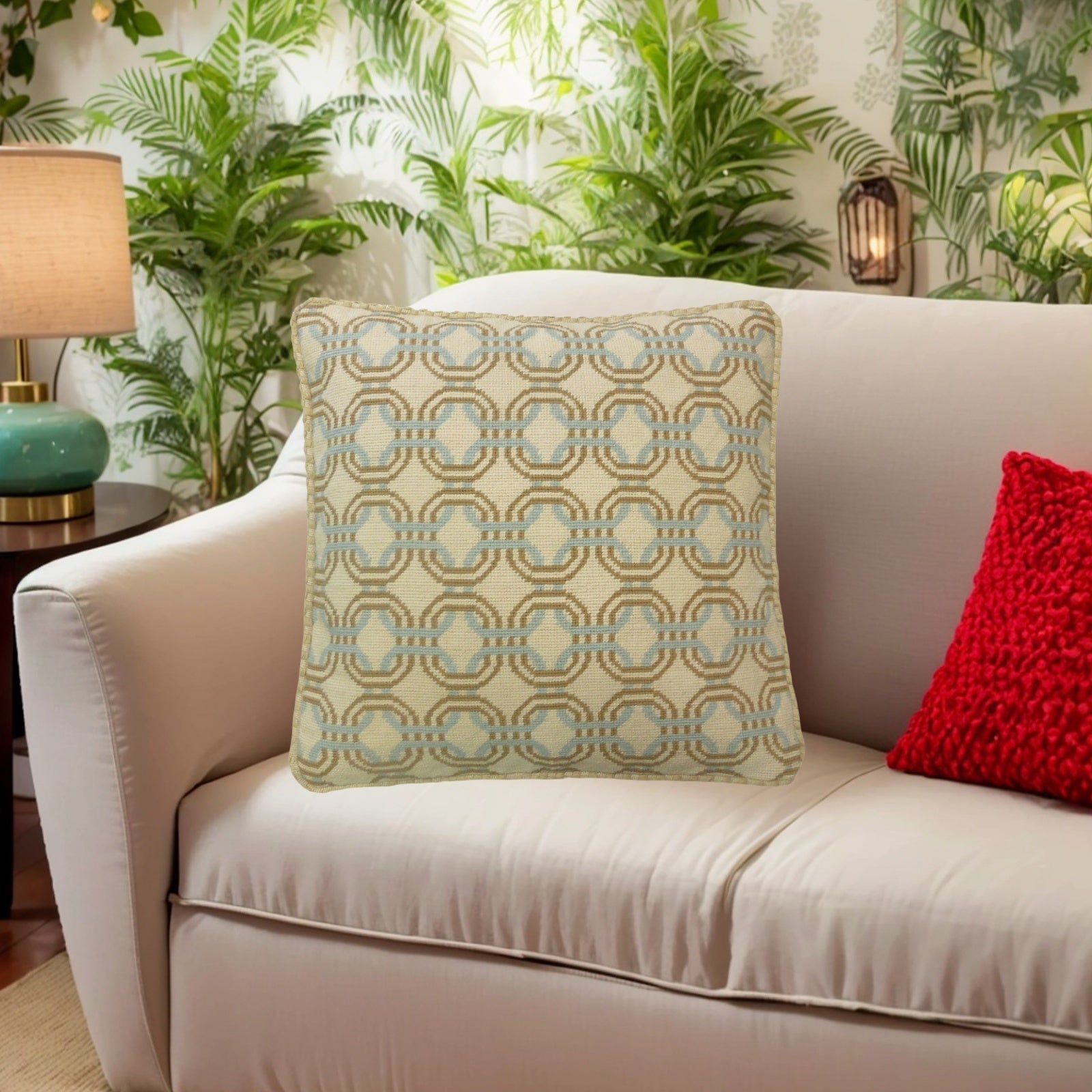 Handmade Wool Needlepoint Pillow Cover - Decorative Throw Cushion Cover - Vintage Floral Embroidery Design chain circle light blue/mustard yellow checker cording