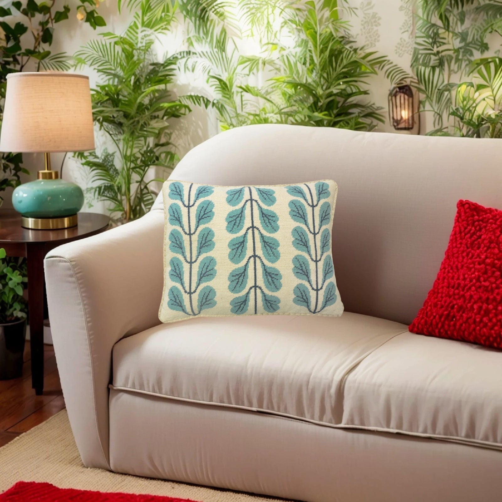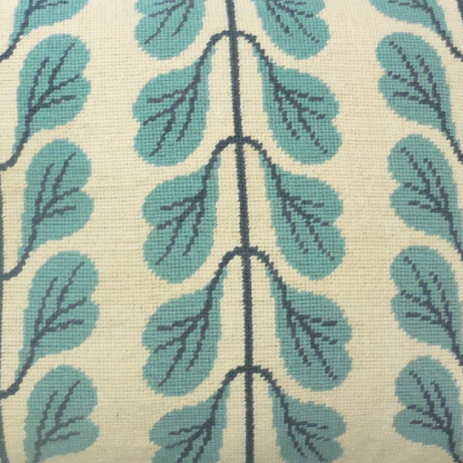Handmade Wool Needlepoint Pillow Cover - Decorative Throw Cushion Cover - Vintage Floral Embroidery Design 3 lines blue leaves checker cording