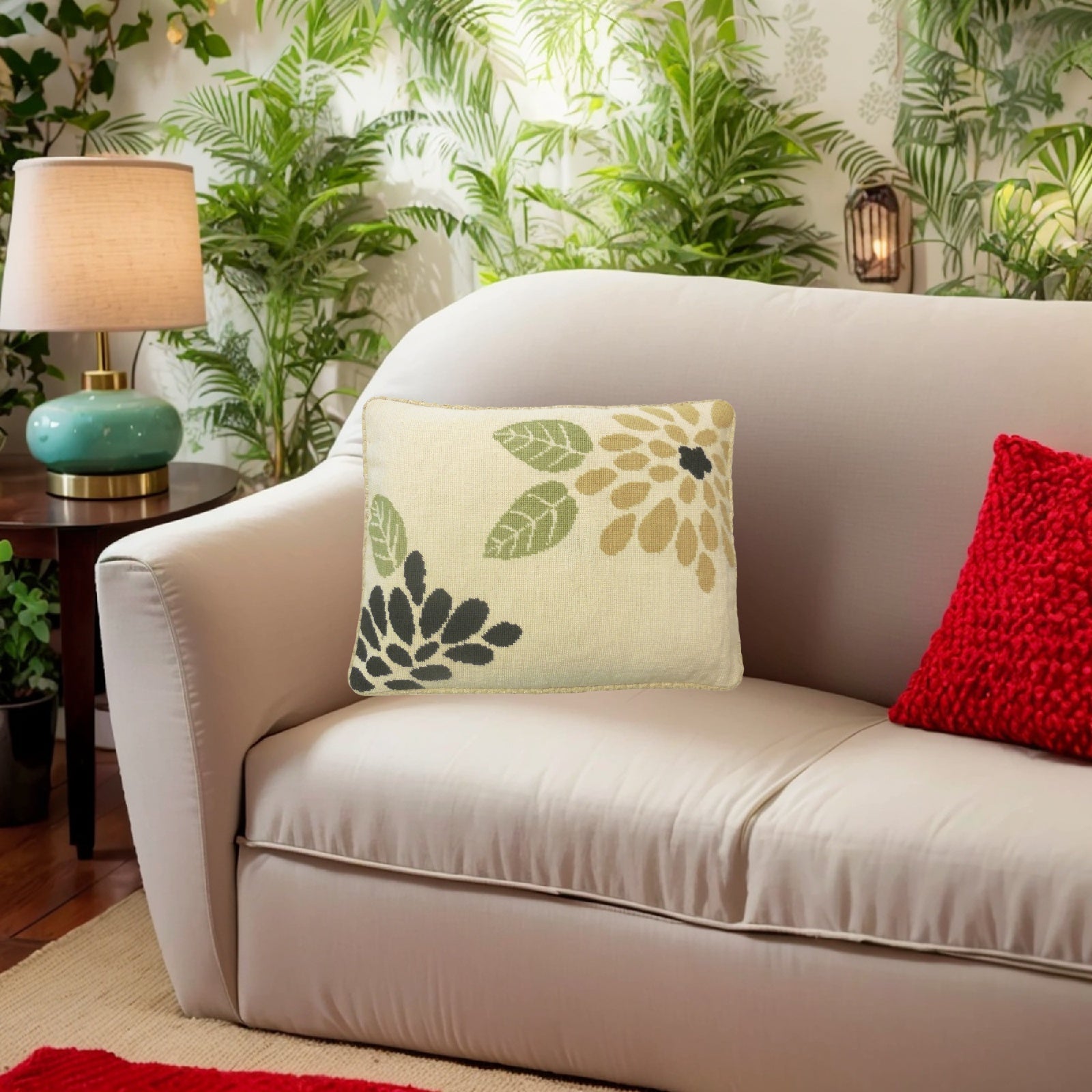 Handmade Wool Needlepoint Pillow Cover - Decorative Throw Cushion Cover - Vintage Floral Embroidery Design abstract flower checker cording