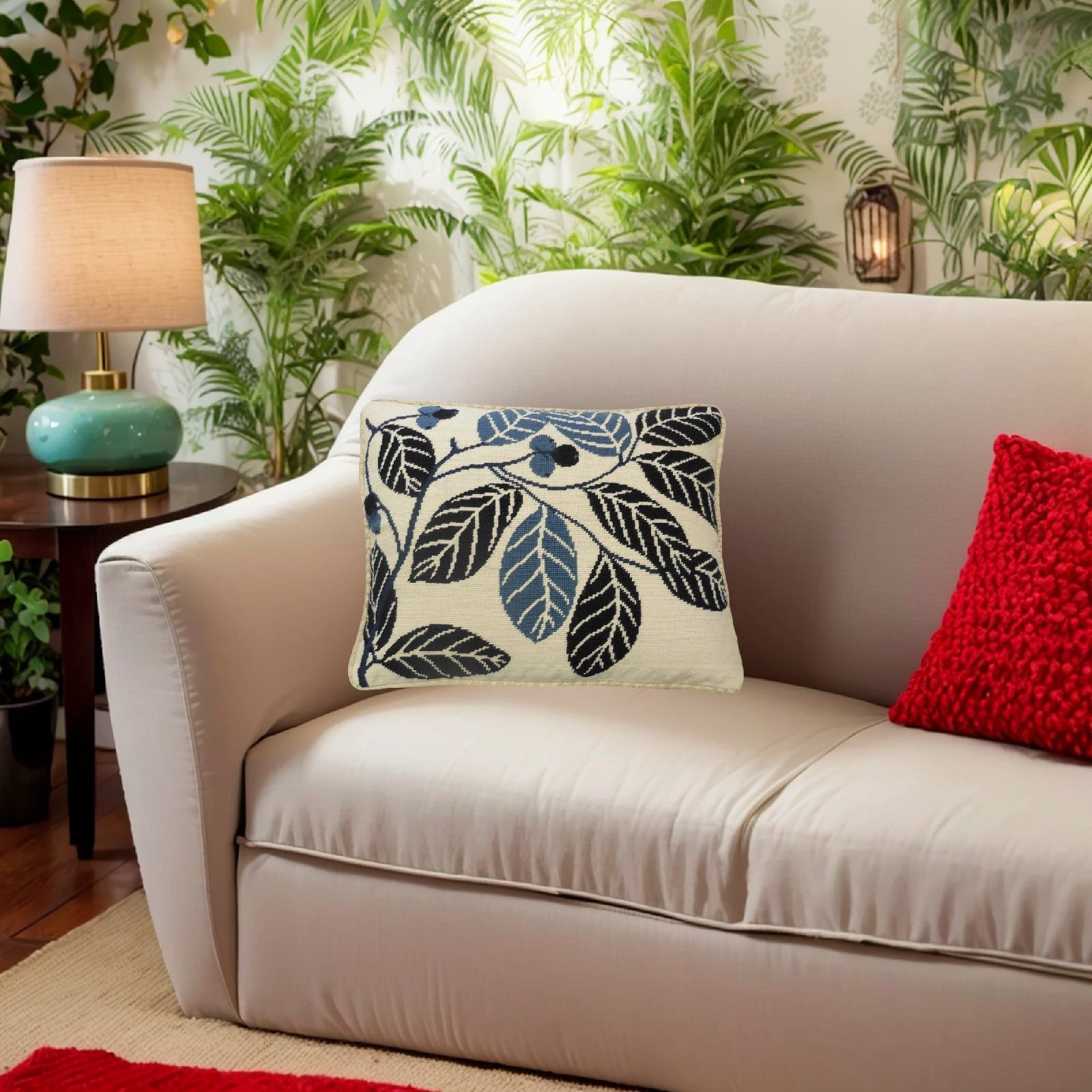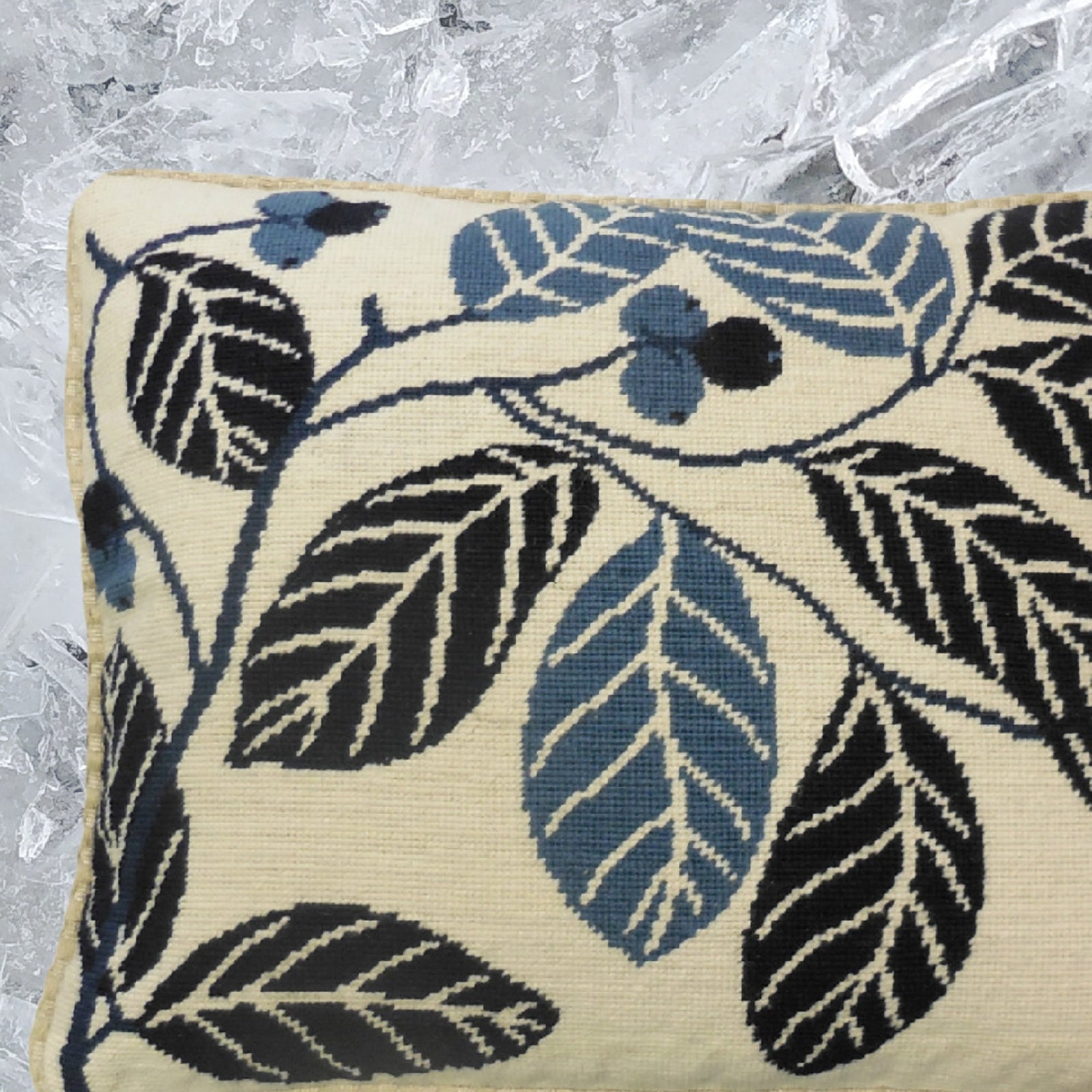 Handmade Wool Needlepoint Pillow Cover - Decorative Throw Cushion Cover - Vintage Floral Embroidery Design blue cherry checker cording