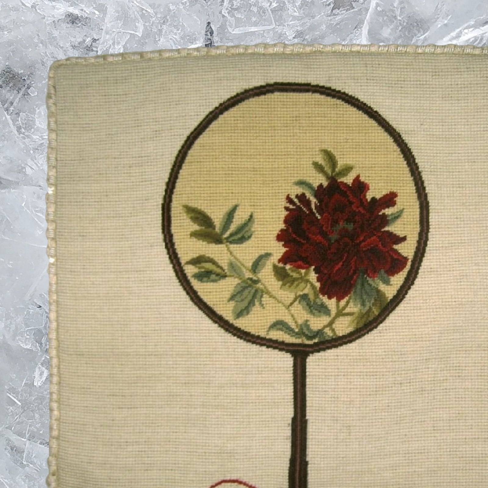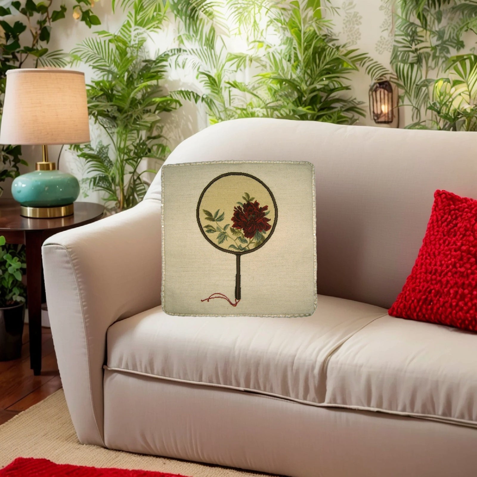 Handmade Wool Needlepoint Pillow Cover - Decorative Throw Cushion Cover - Vintage Floral Embroidery Design red peony in Chines fan with checker cording