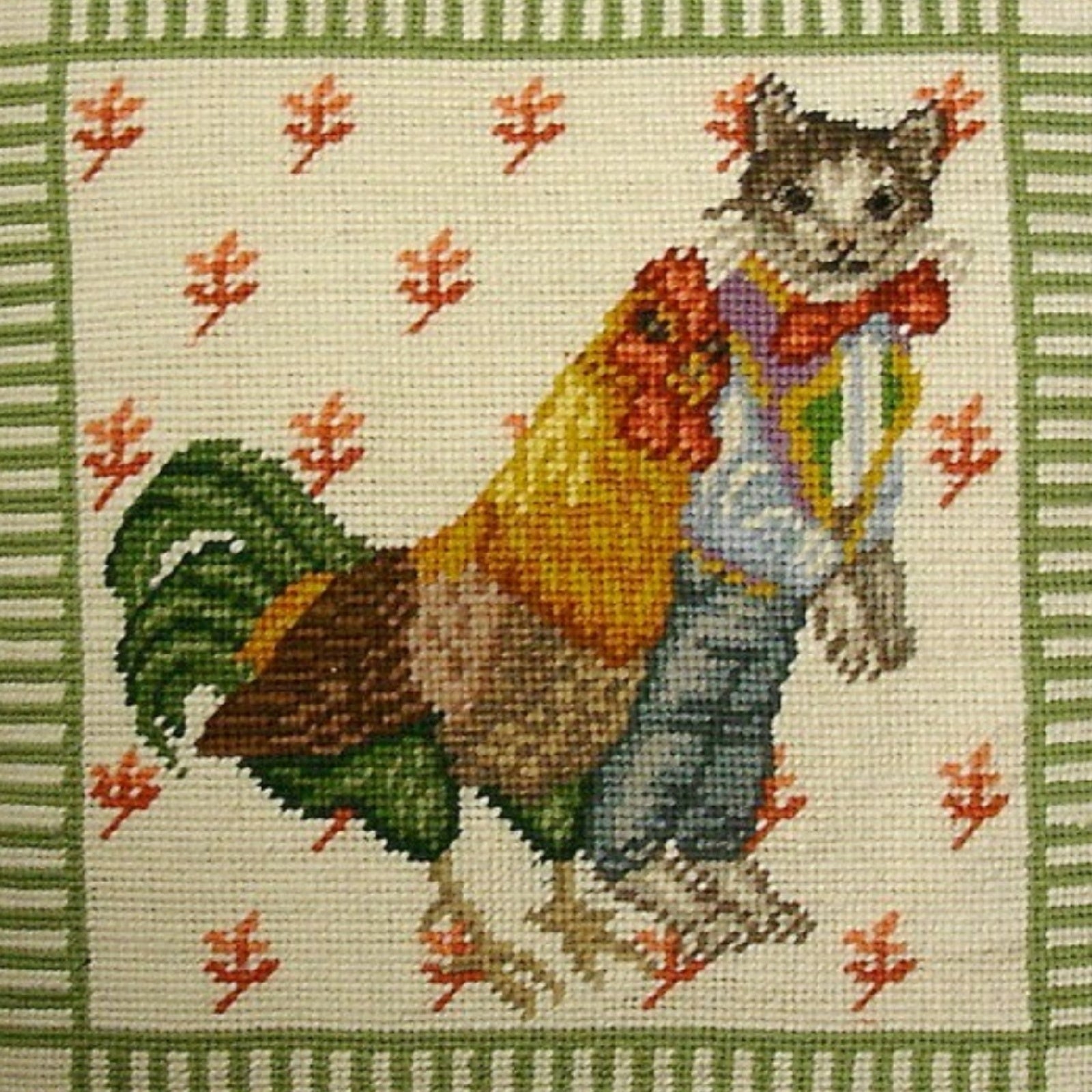 Handmade Wool Needlepoint Pillow Cover - Decorative Throw Cushion Cover - Vintage Floral Embroidery Design cat boy & chicken ladybug on 4 corners mauve & yellow cording