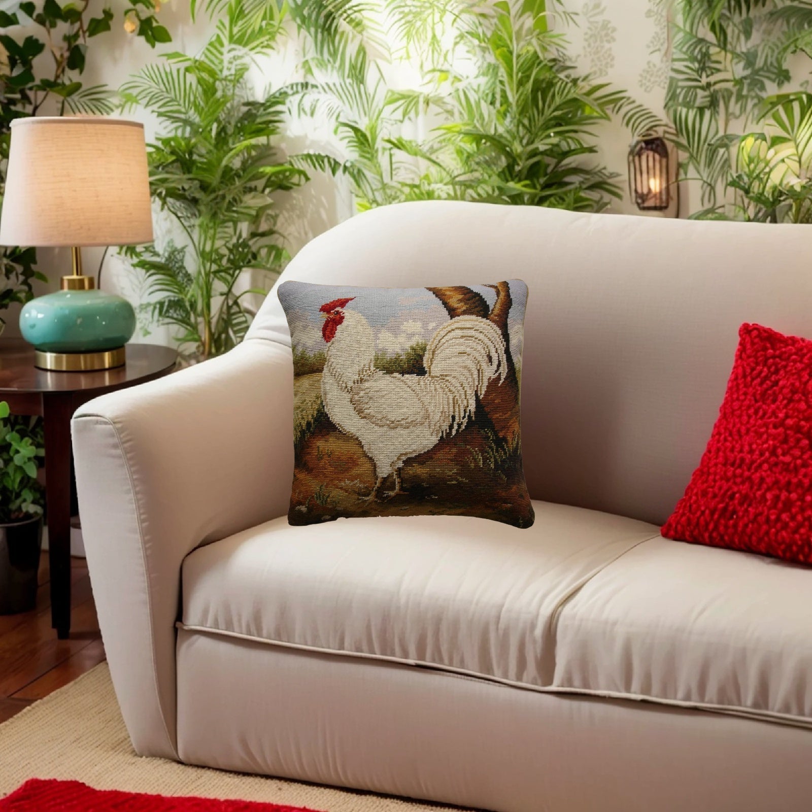 Handmade Wool Needlepoint Pillow Cover - Decorative Throw Cushion Cover - Vintage Floral Embroidery Design roosterHenry