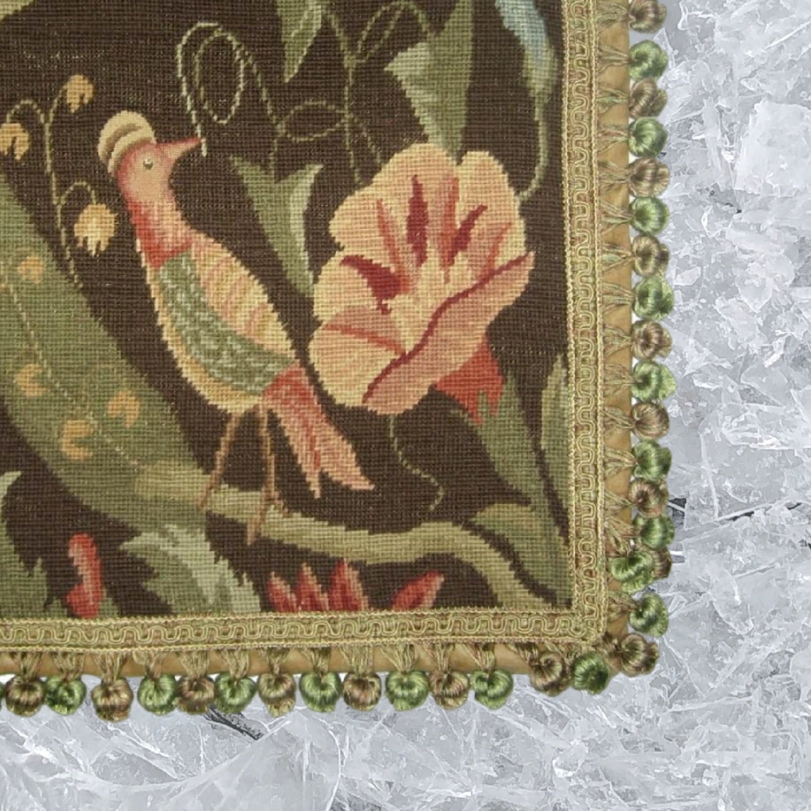 Handmade Wool Needlepoint Pillow Cover - Decorative Throw Cushion Cover - Vintage Floral Embroidery Design morning-glory/bird with tassel