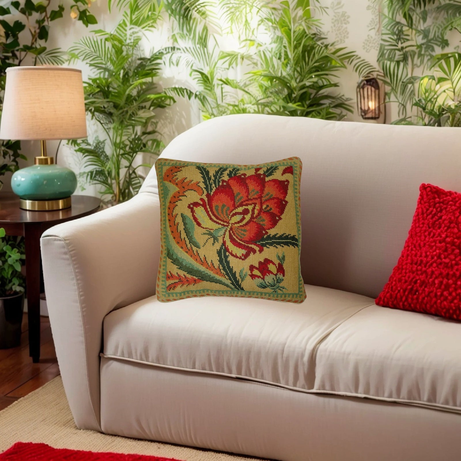 Handmade Wool Needlepoint Pillow Cover - Decorative Throw Cushion Cover - Vintage Floral Embroidery Design flower in shade of rich gold, red, green