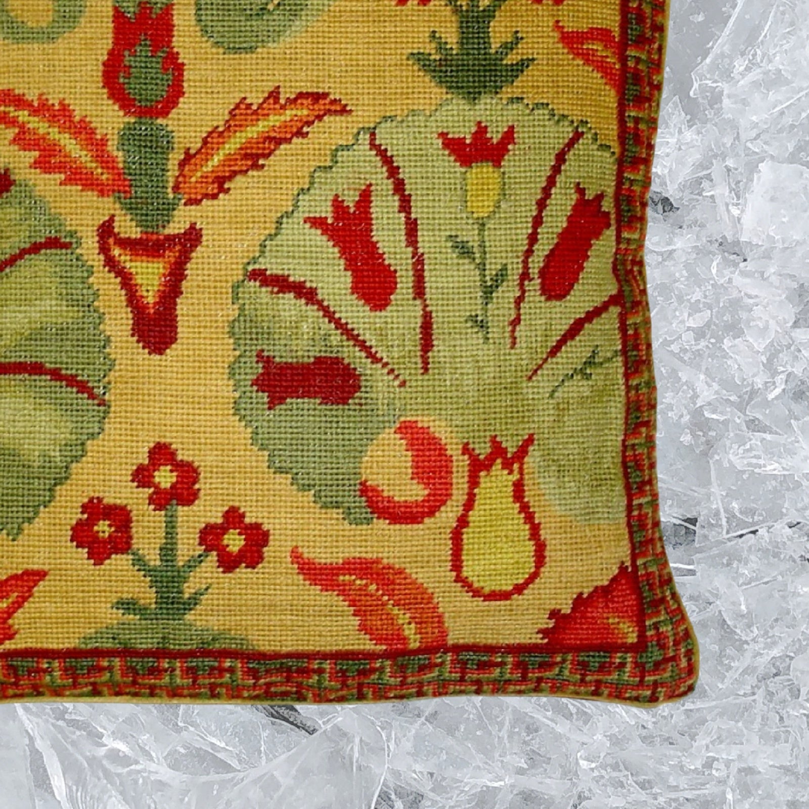 Handmade Wool Needlepoint Pillow Cover - Decorative Throw Cushion Cover - Vintage Floral Embroidery Design leaves in shade of rich gold, red, green