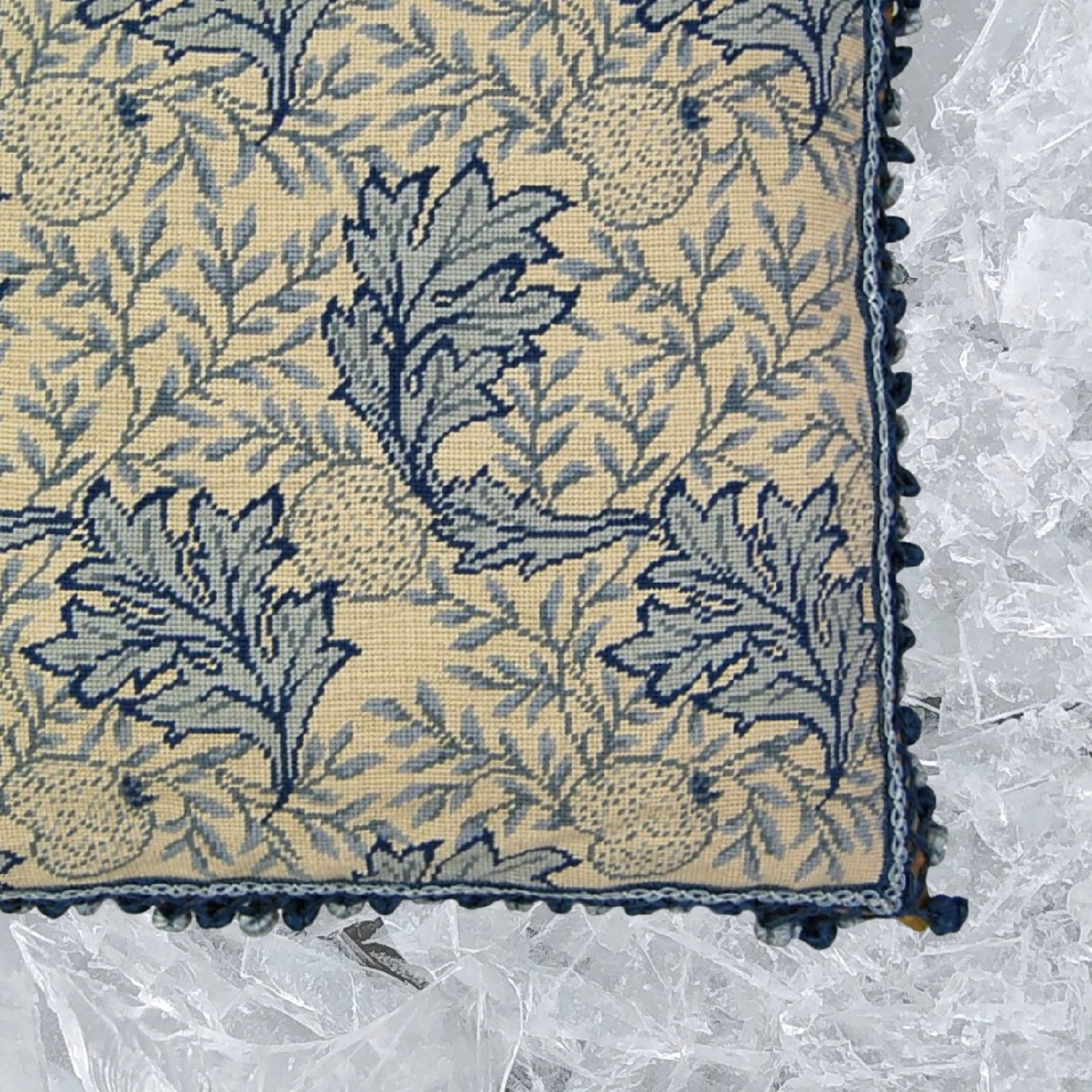 Handmade Wool Needlepoint Pillow Cover - Decorative Throw Cushion Cover - Vintage Floral Embroidery Design blue/white William Morris grapes leaves with 2 color tassels